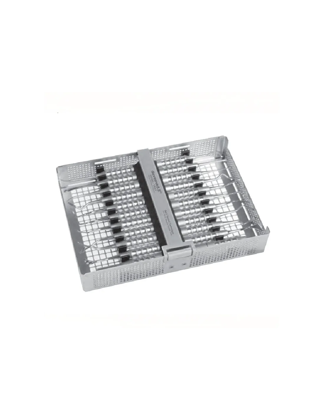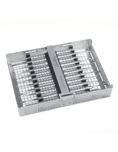 Todo presentado en una bandeja de esterilización con clip 9200-80 GPM. Fabricada en acero inoxidable con tiras de silicona para una firme sujeción de los instrumentos durante el lavado o almacenamiento. Sus grandes perforaciones garantizan una limpieza eficaz. Medidas: 177,5 x 127,5 x 33,0 mm.
