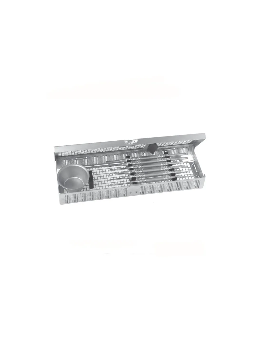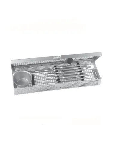 Todo presentado en una caja de esterilización (bandeja, tapa) 9100-50 GPM. Fabricada en acero inoxidable con tiras de silicona para una firme sujeción de los instrumentos durante el lavado o almacenamiento. Sus grandes perforaciones garantizan una limpieza eficaz. Medidas: 275,0 x 87,0 x 35,0 mm.