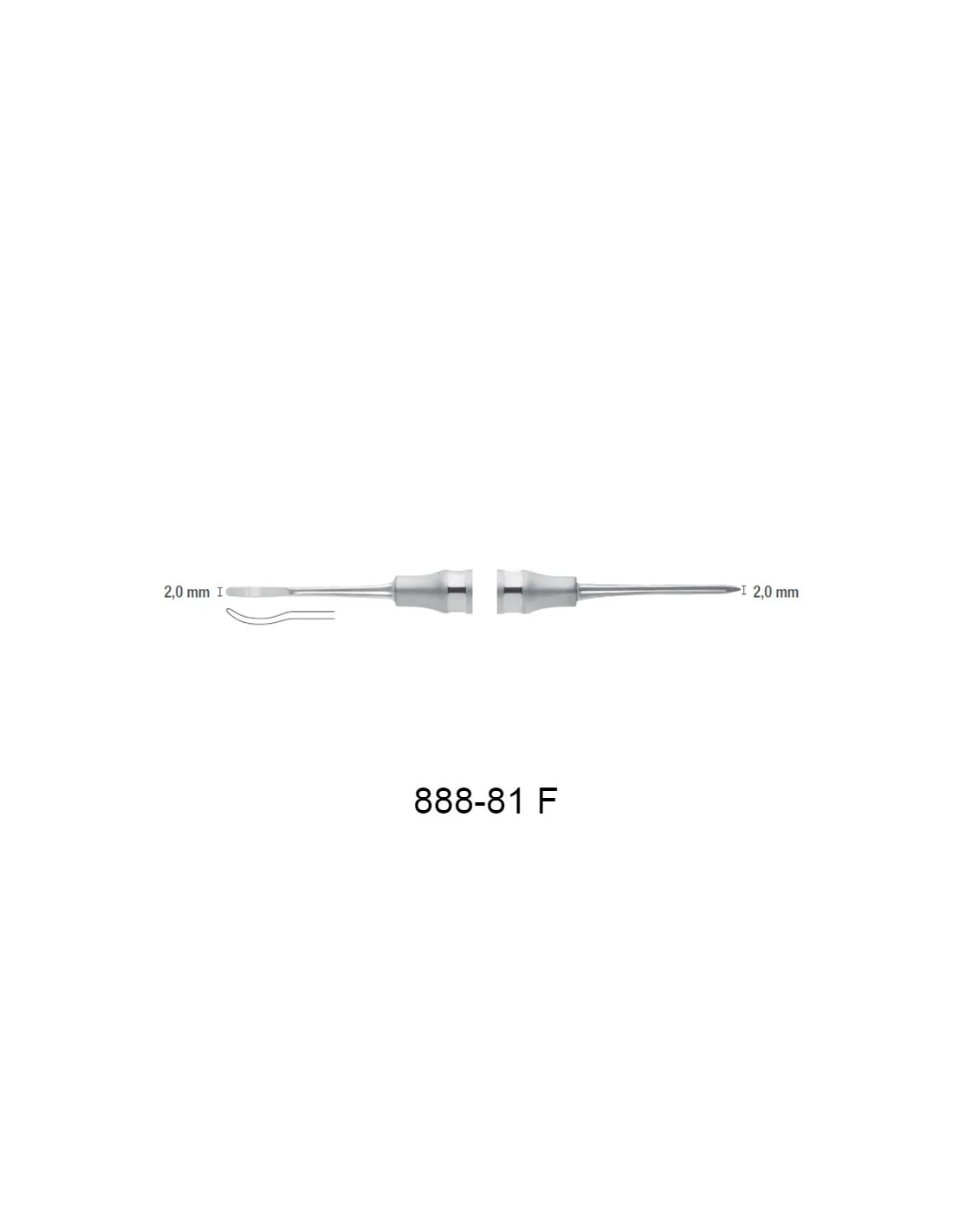 - 888-81 F - Micro Elevador Interdental-Perióstico Palti - 17,1 cm - 2,0 mm. - El elevador perióstico fue diseñado específicamente para su uso en cirugía periodontal. Es crucial para un procedimiento exitoso, especialmente en relación con las medidas regenerativas, que se logre un cierre hermético de la herida después de la cirugía. Un requisito previo para ello es la máxima conservación posible de los tejidos blandos. Este problema se presenta en el área interdental y gracias este elevador perióstico muy estrecho y afilado la tarea se simplifica.