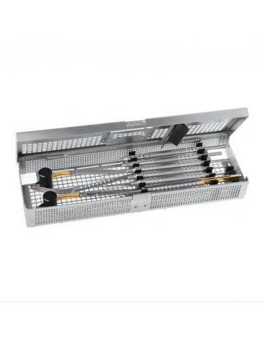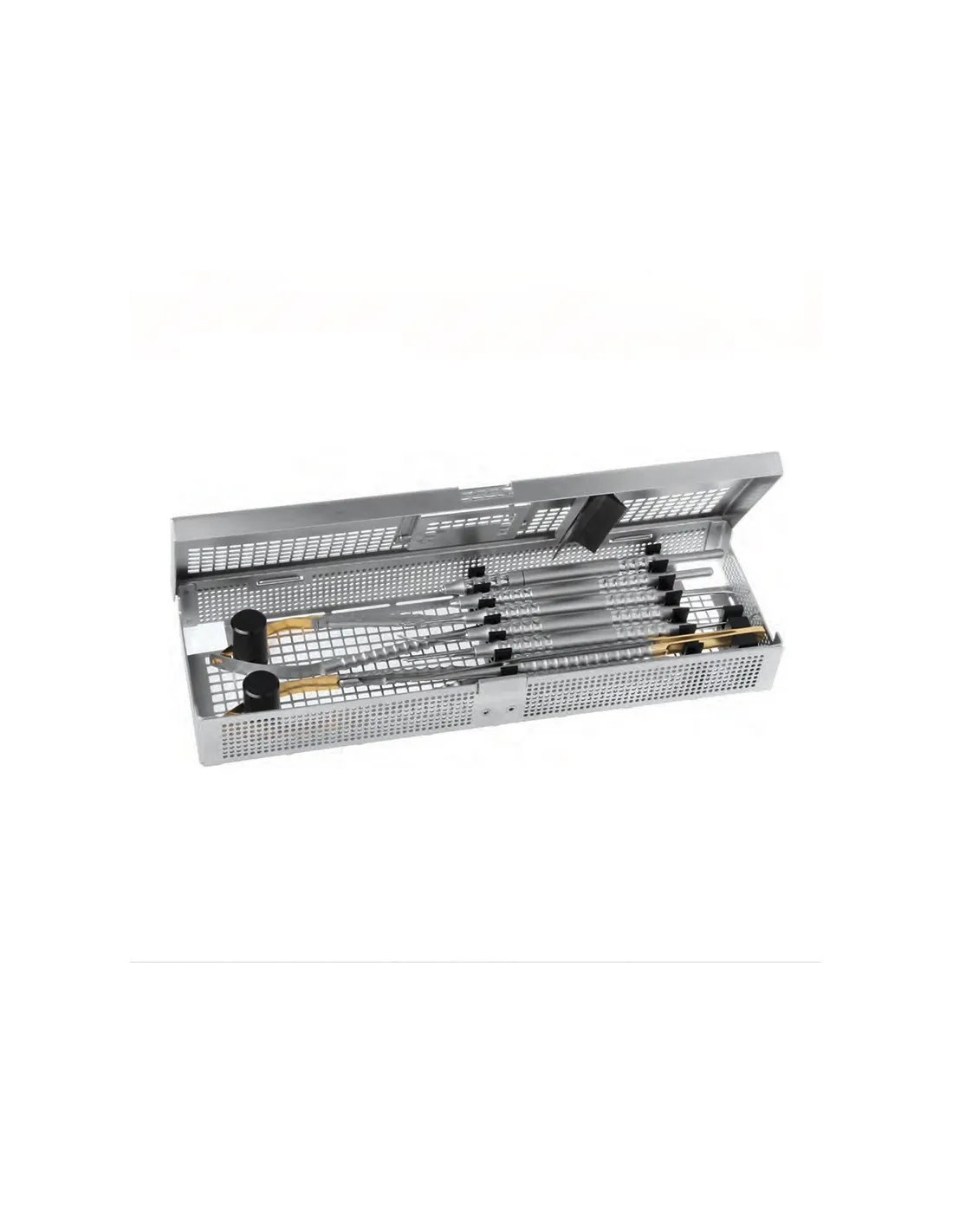 Todo presentado en una caja de esterilización (bandeja, tapa y mango) 9200-32 GPM. Fabricada en acero inoxidable con tiras de silicona para una firme sujeción de los instrumentos durante el lavado o almacenamiento. Sus grandes perforaciones garantizan una limpieza eficaz. Medidas: 275,0 x 87,0 x 35,0 mm.