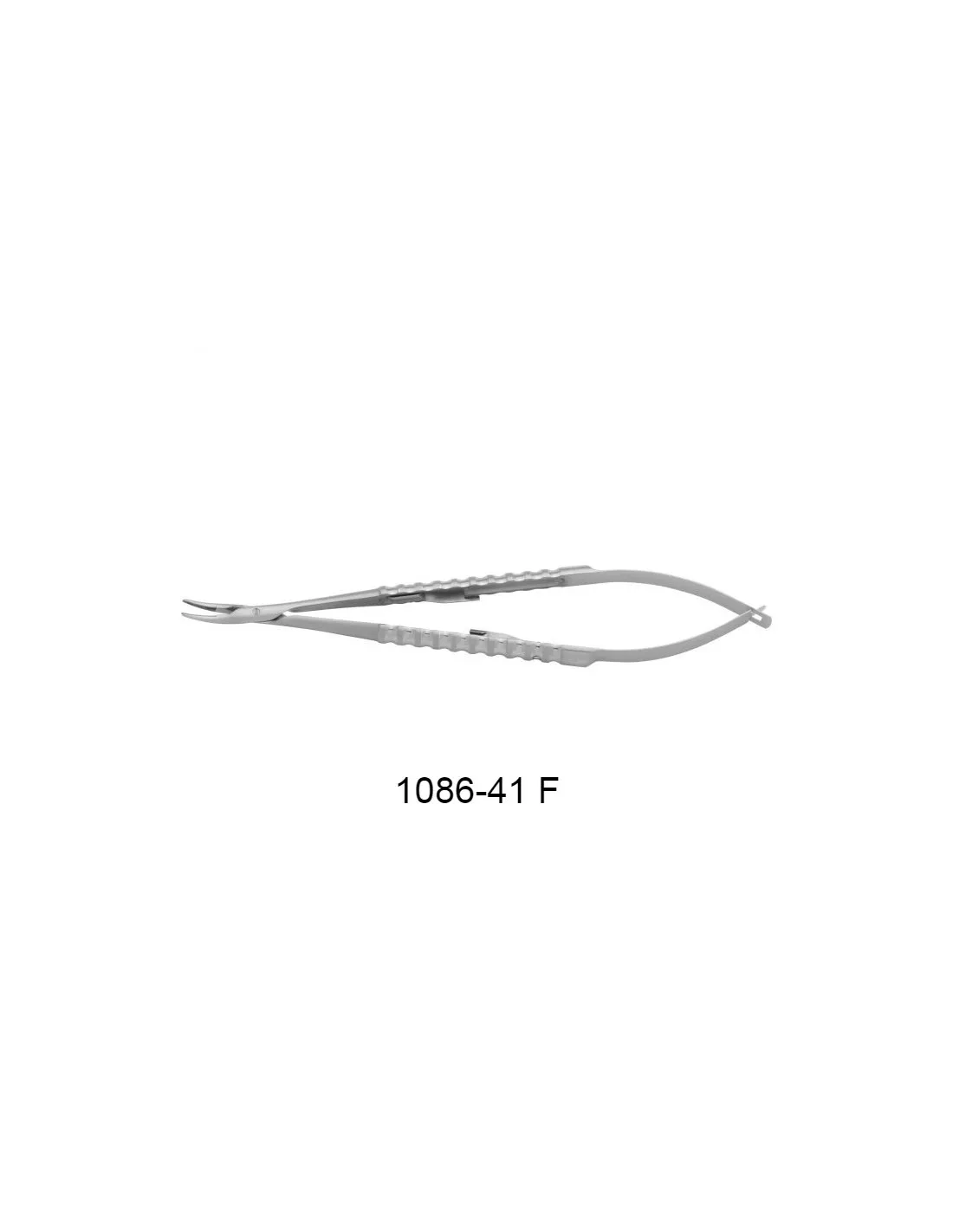 1086-41 F - Porta agujas Barraquer - TC, - ø0,8 mm, 17,1 cm, curvo. Mango RS. Para microagujas con bloqueo para cirugía mínimamente invasiva. Con carburo de tungstero. Se recomienda su uso con hilo de sutura: 5-0 y 8-0.