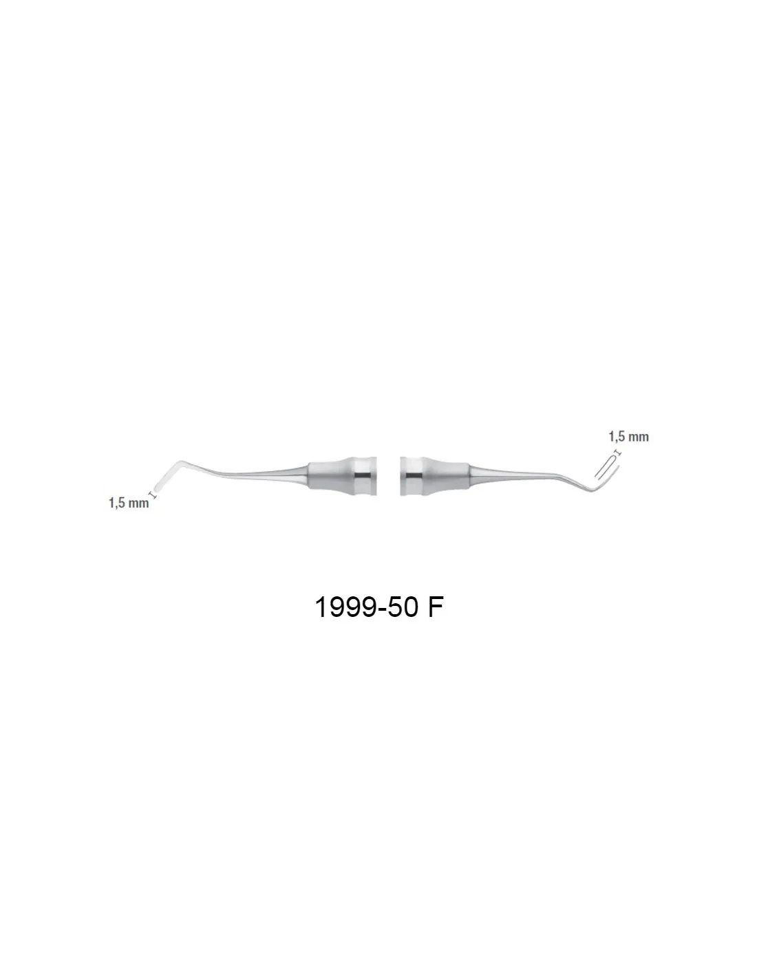 - 1999-50 F - ECI Instrumento composite para restauraciones estéticas - espátula, distal - Doble parte activa: 1,5 / 1,5 mm. - Este instrumento delicado y flexible y espatulado se emplea para bruñir y tallar en áreas proximales de difícil acceso.