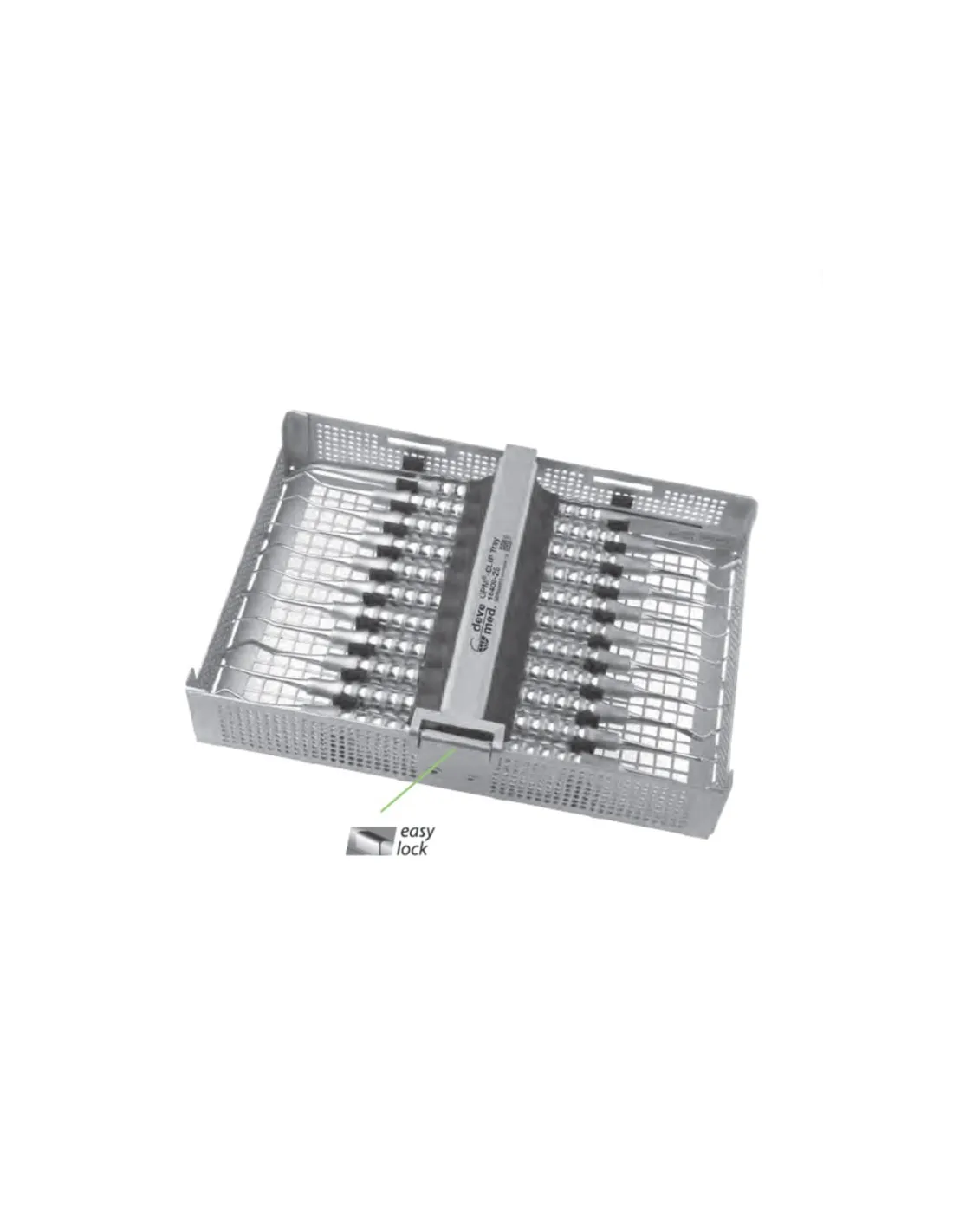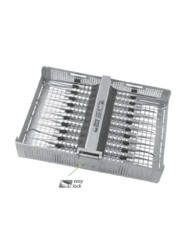 Todo presentado en una bandeja de esterilización 9200-80 GPM. Fabricada en acero inoxidable con tiras de silicona para una firme sujeción de los instrumentos durante el lavado o almacenamiento. Sus grandes perforaciones garantizan una limpieza eficaz. Medidas: 177,5 x 127,5 x 33,0 mm.