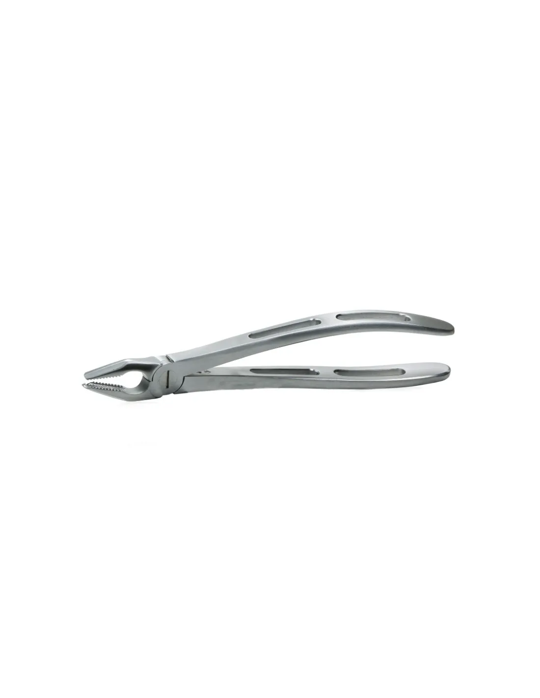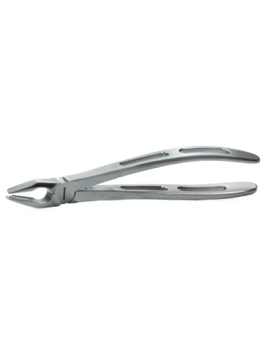La cabeza del fórceps es fina, delgada y aplanada lateralmente con un dentado potente que permite un agarre profundo del diente hasta el alveolo, así como un óptimo movimiento de rotación proximal.