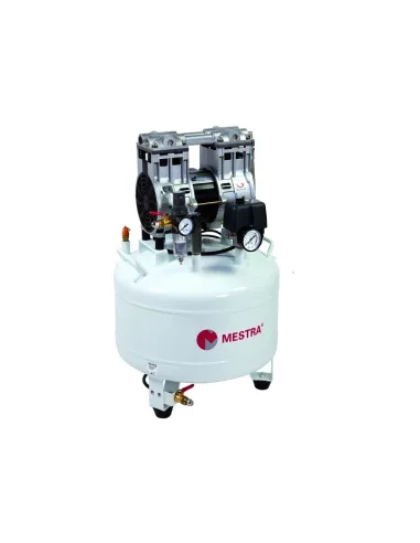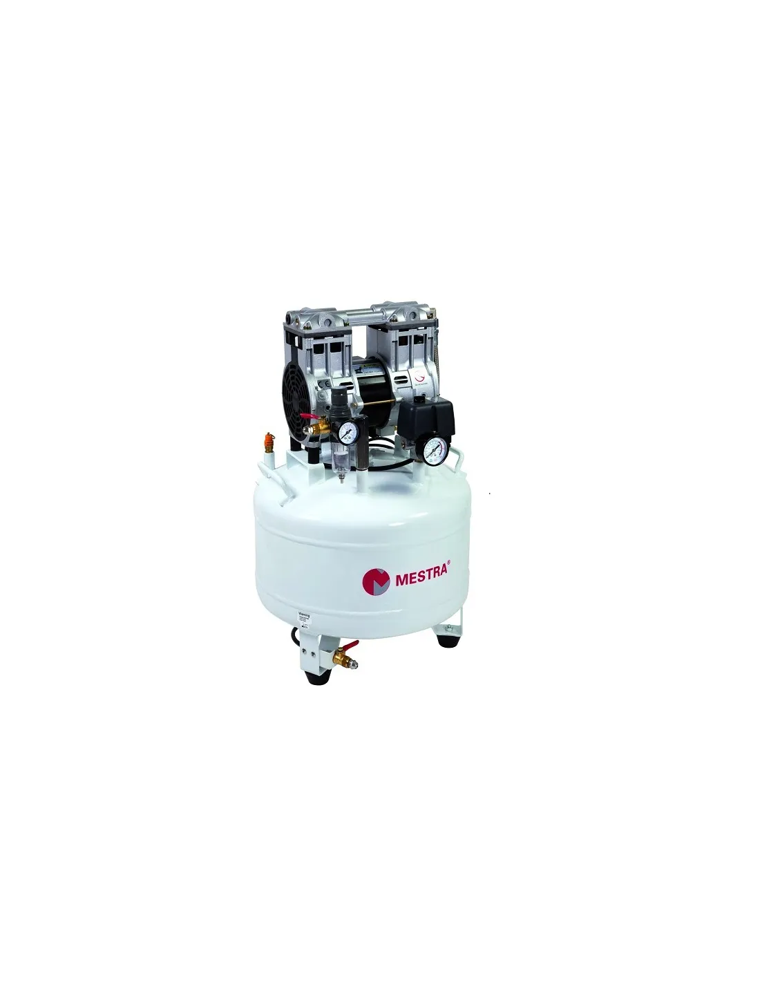 Compresor a pistón seco de Mestra con calderín de 30 litros de capacidad, destaca por su excelente fiabilidad, funcionamiento ultrasilencioso, durabilidad y facilidad de matenimiento.