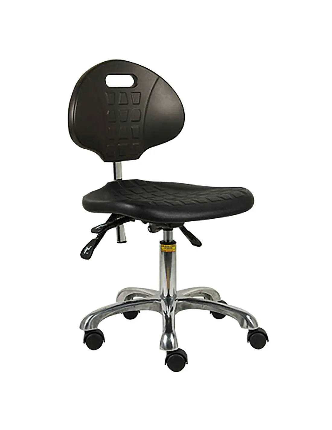 Esta silla de trabajo cuenta con base de cruz apoyada sobre 5 ruedas con sistema de frenado de seguridad (EN 1335-2:2009).