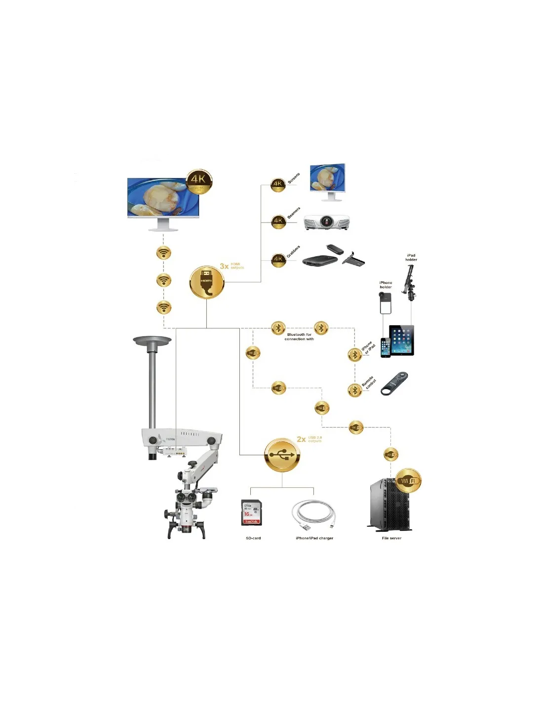 Con salida USB de la cámara en el brazo del microscopio y sistema bluetooth y wifi.