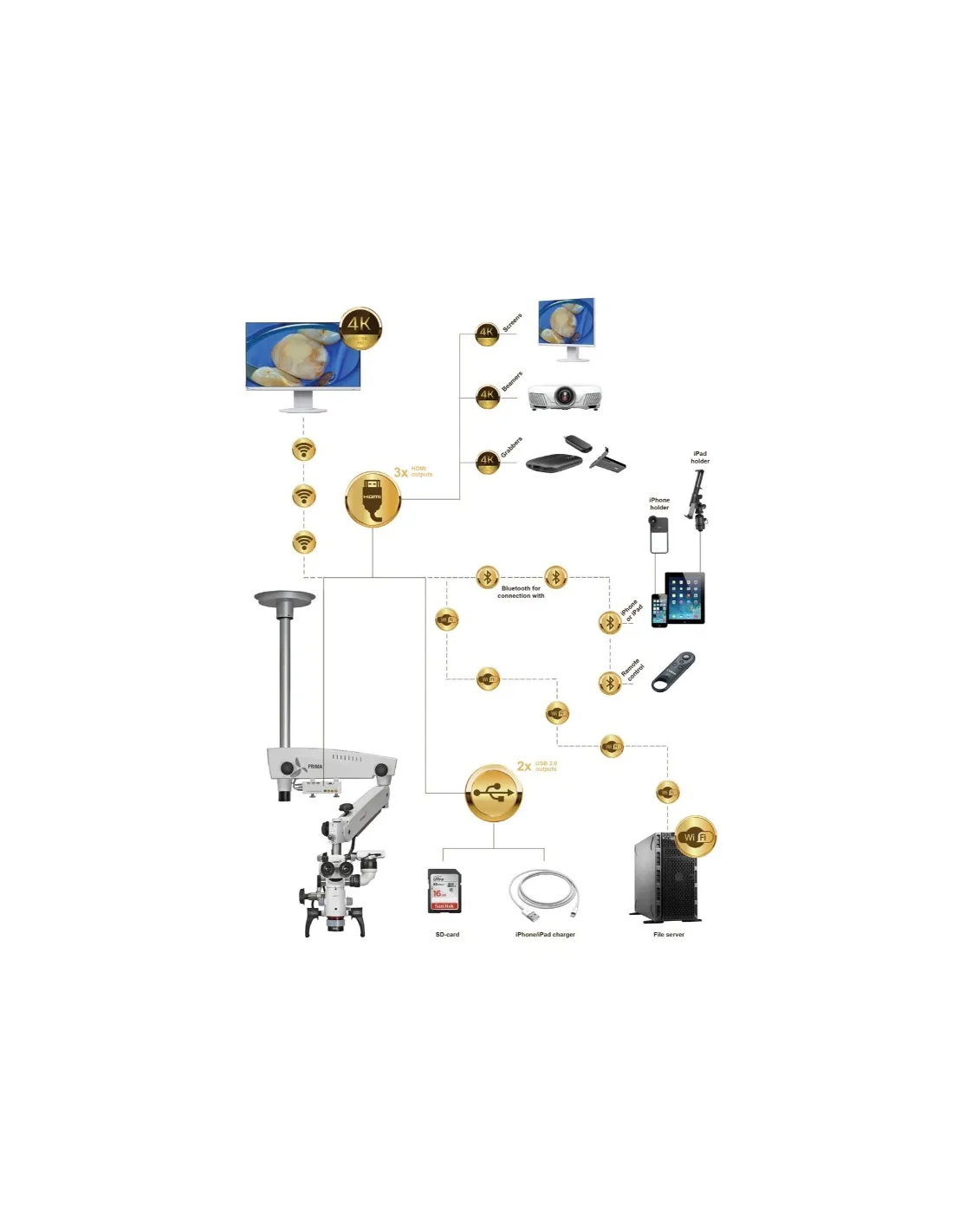 Con salida USB de la cámara en el brazo del microscopio y sistema bluetooth y wifi.