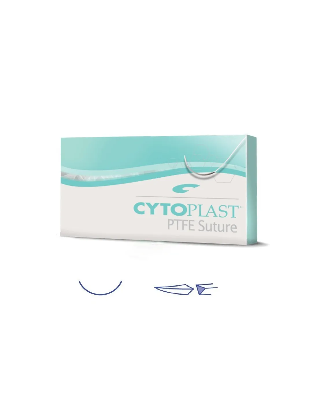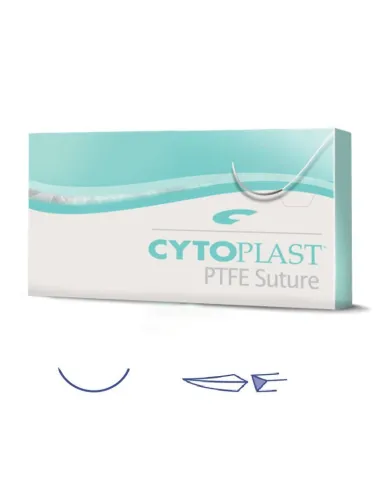 Cytoplast de Octeogenics es una sutura quirúrgica blanca de PTFE (politetrafluoroetileno) de grado médico 100%, biológicamente inerte, con agujas de acero inoxidable Serie 300.