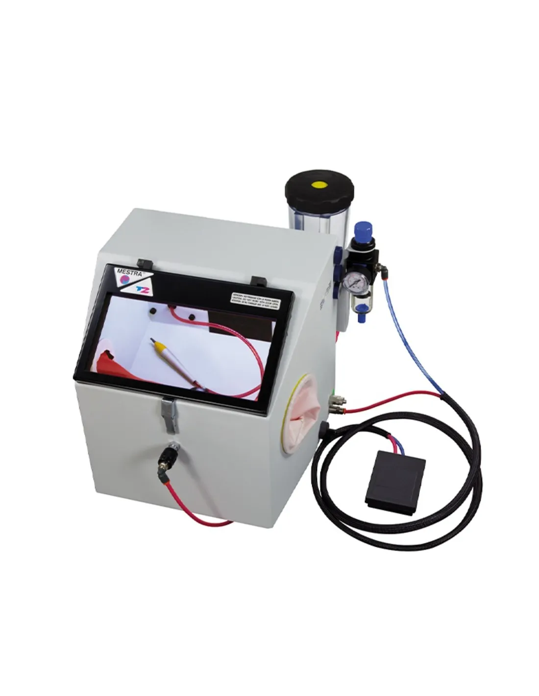 La microarenadora Terra II de Mestra ofrece una óptima visibilidad a través del cristal de su ventana para facilitar la realización de cualquier labor de arenado.