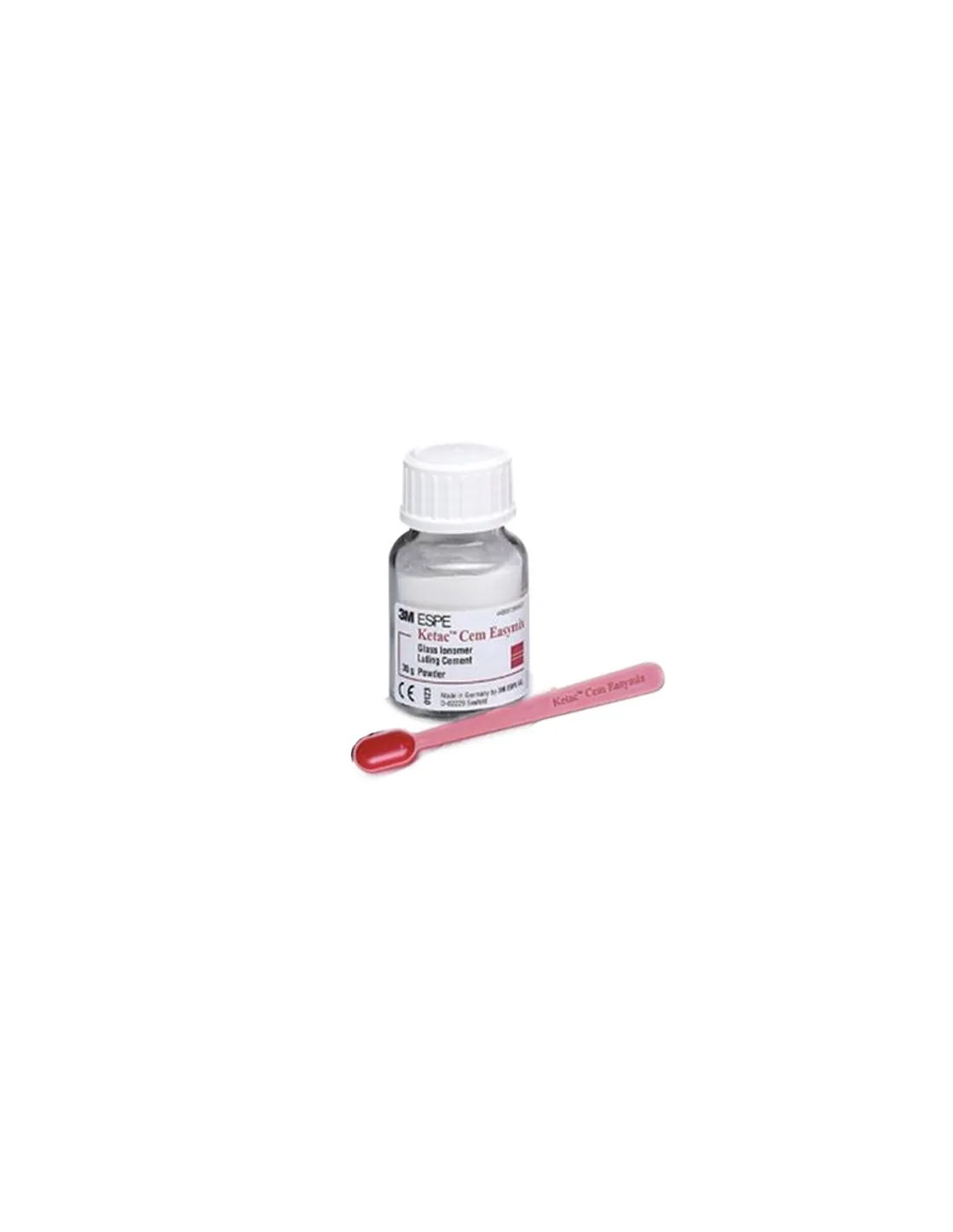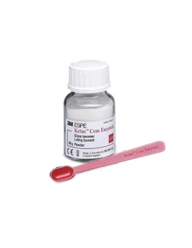 Frasco con 30gr de polvo para Ketac Cem Easymix, un cemento definitivo de ionómero de vidrio indicado para cementar puentes y coronas, inlays y onlays, postes y screws, y bandas ortodónticas.