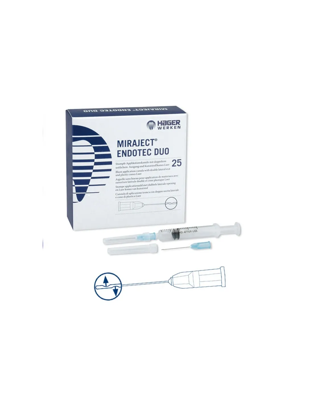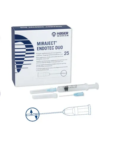 La aguja Miraject Endotec Duo presenta un diseño de cánula especial con doble apertura lateral de irrigación para un proceso más suave y eficiente.