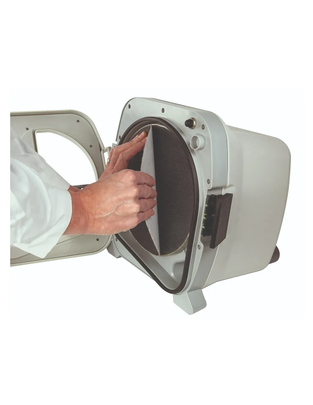 La recortadora Serantes fabricada en composite de alta resistencia, anticorrosión, cuenta con tapa con apertura sencilla para acceder al disco, discos con fijación del tipo gancho/lazo fácilmente cambiable y sistema de limpieza por agua.