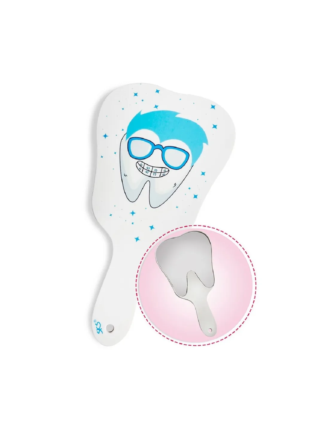 Espejo con forma de muela con un divertido diseño de una muela con ortodoncia y pelazo en color rosa o azul, a elegir.