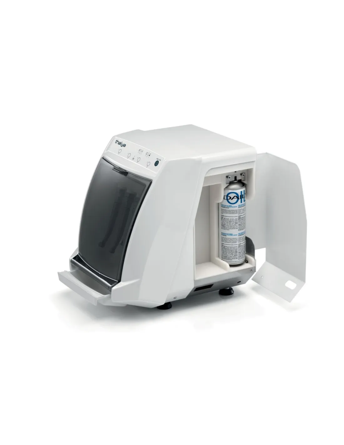 Con sistema plug and play, Thalya es tan sencilla de utilizar como conectar la máquina al aire comprimido y la alimentación eléctrica, introducir el aerosol lubricante para poder utilizarla inmediatamente.