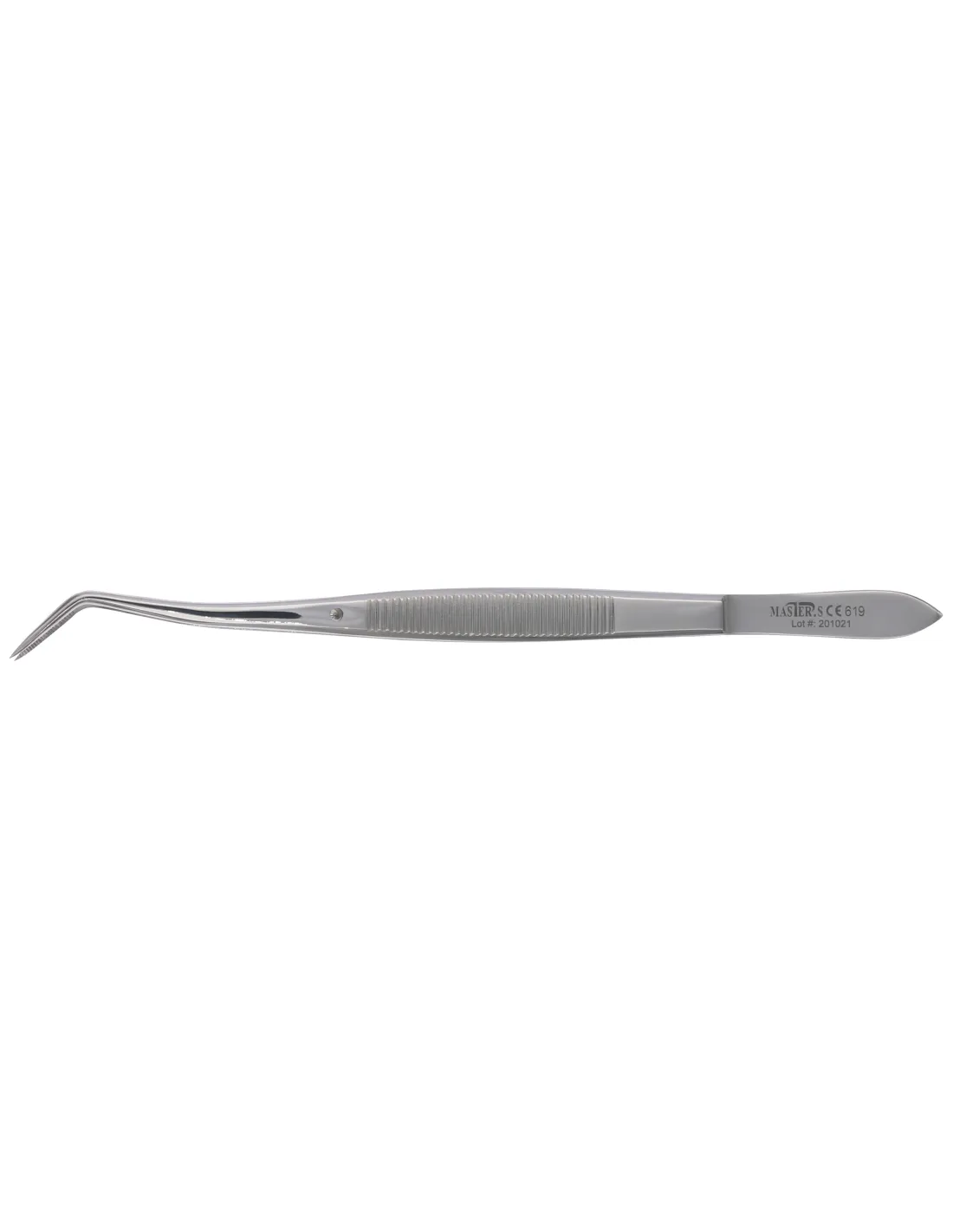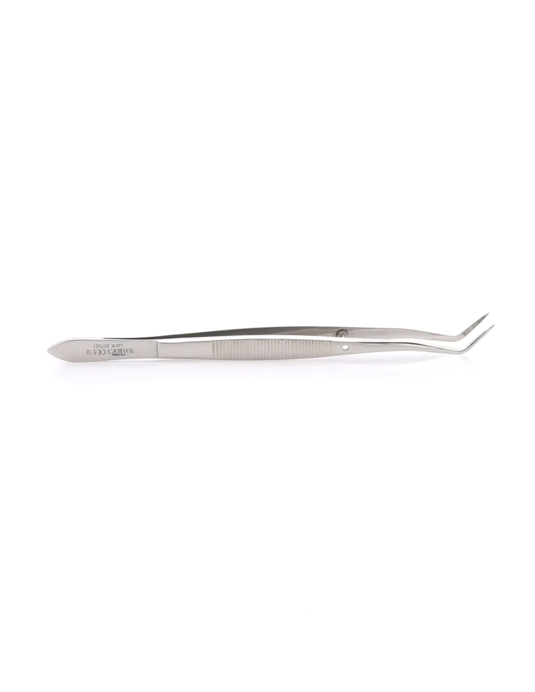 Pinza Meriam convencional, básica en el kit de exploración, la punta es de mayor tamaño y con mayor angulación. No tiene sistema de cierre con grapa.
