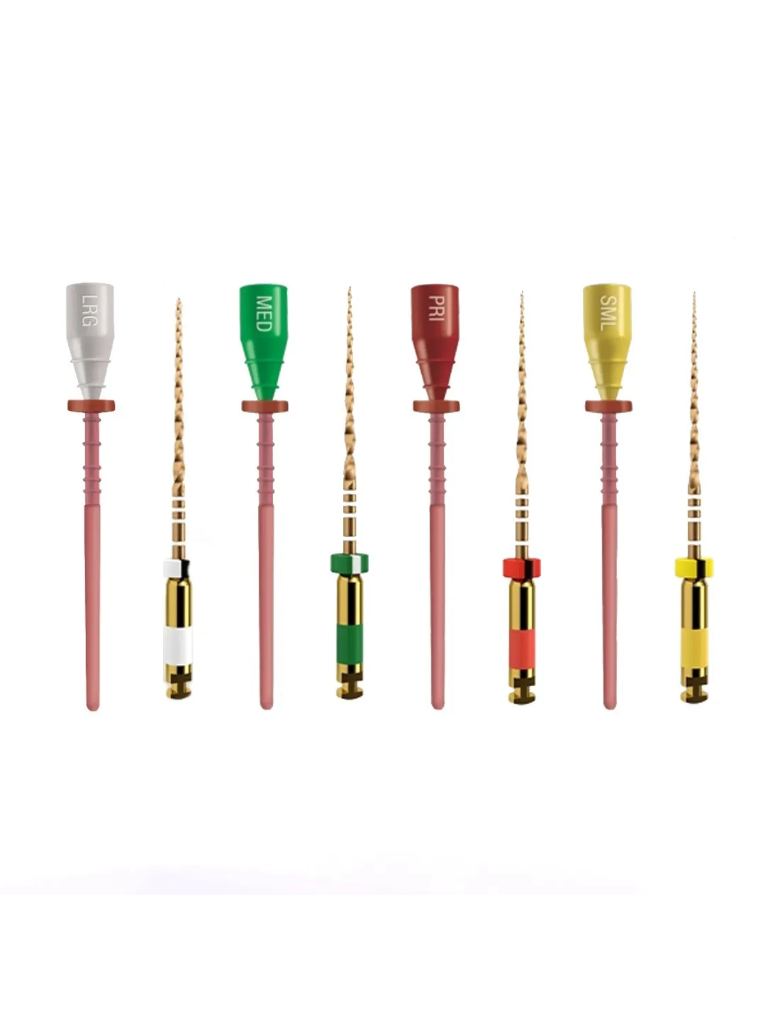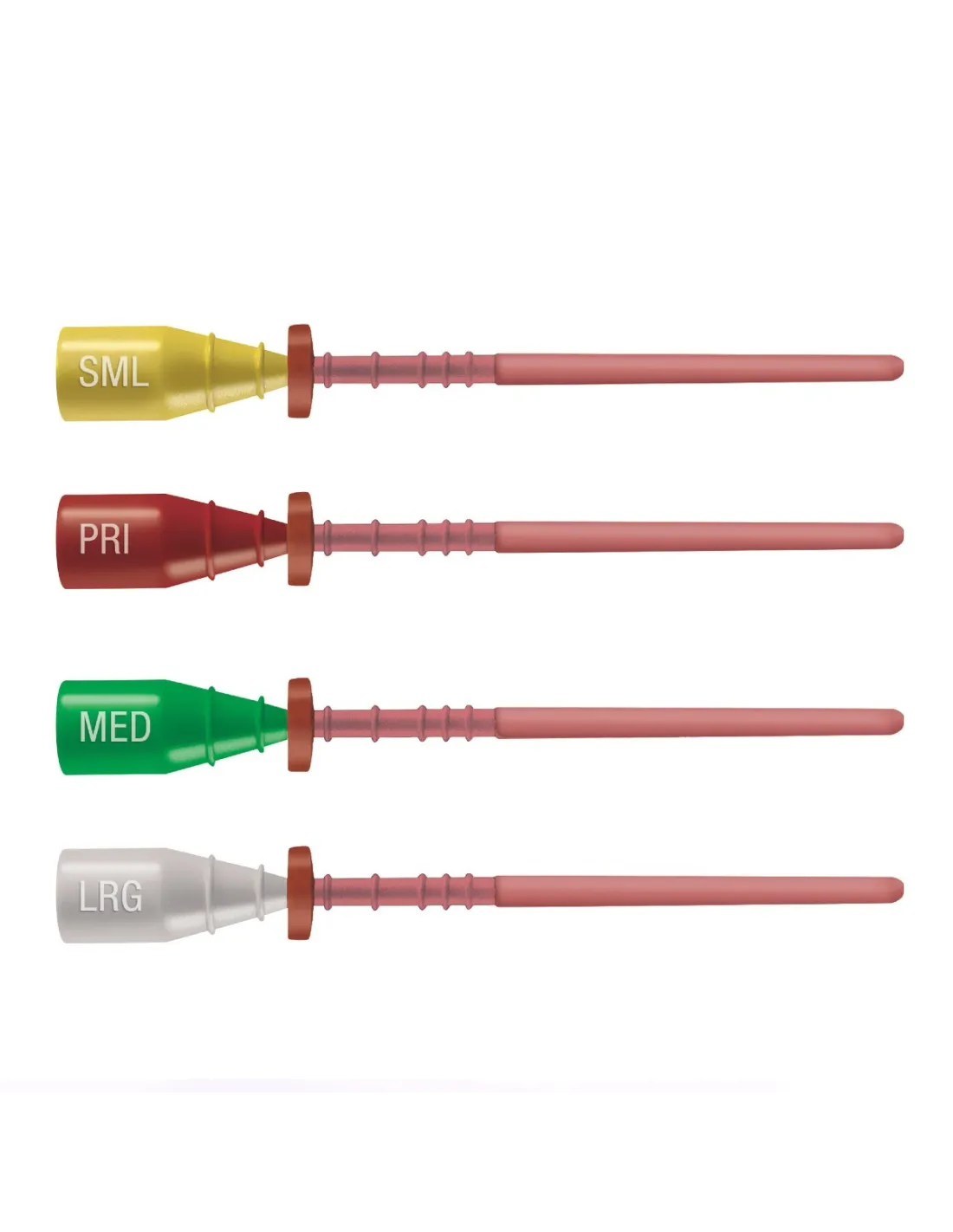 4 tamaños disponibles codificados por color: Primario (rojo) - pequeño (amarillo) - medio (verde) - largo (blanco).