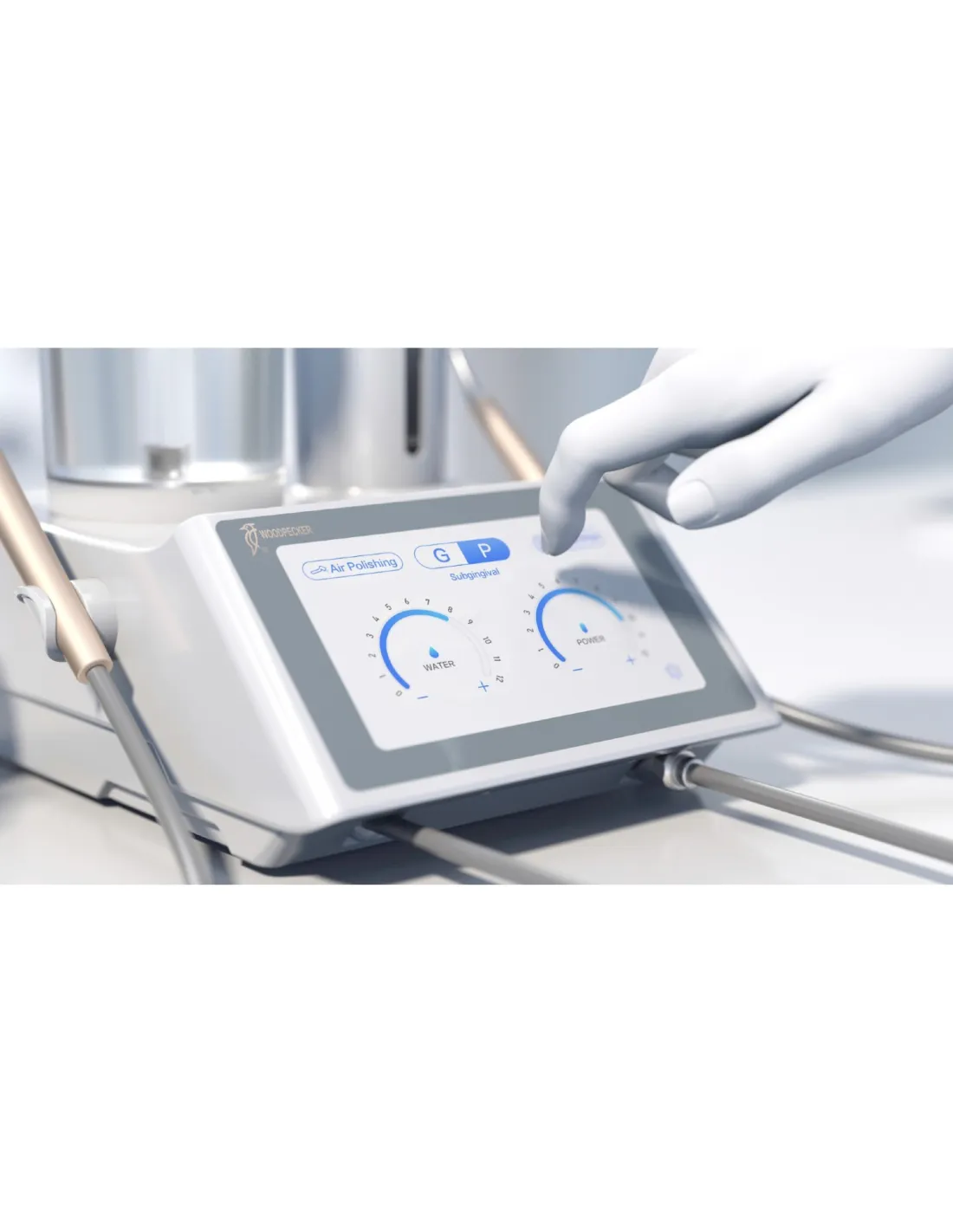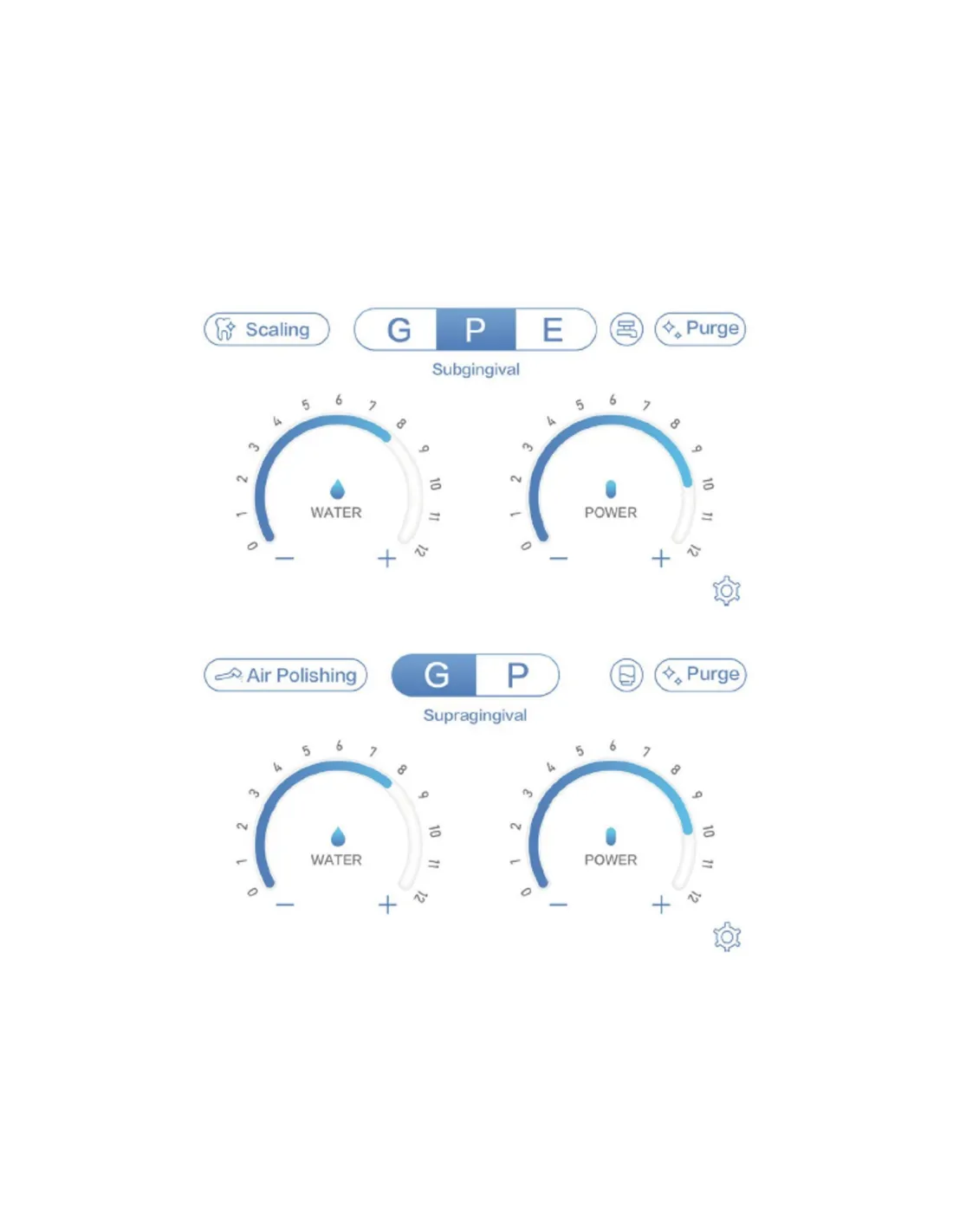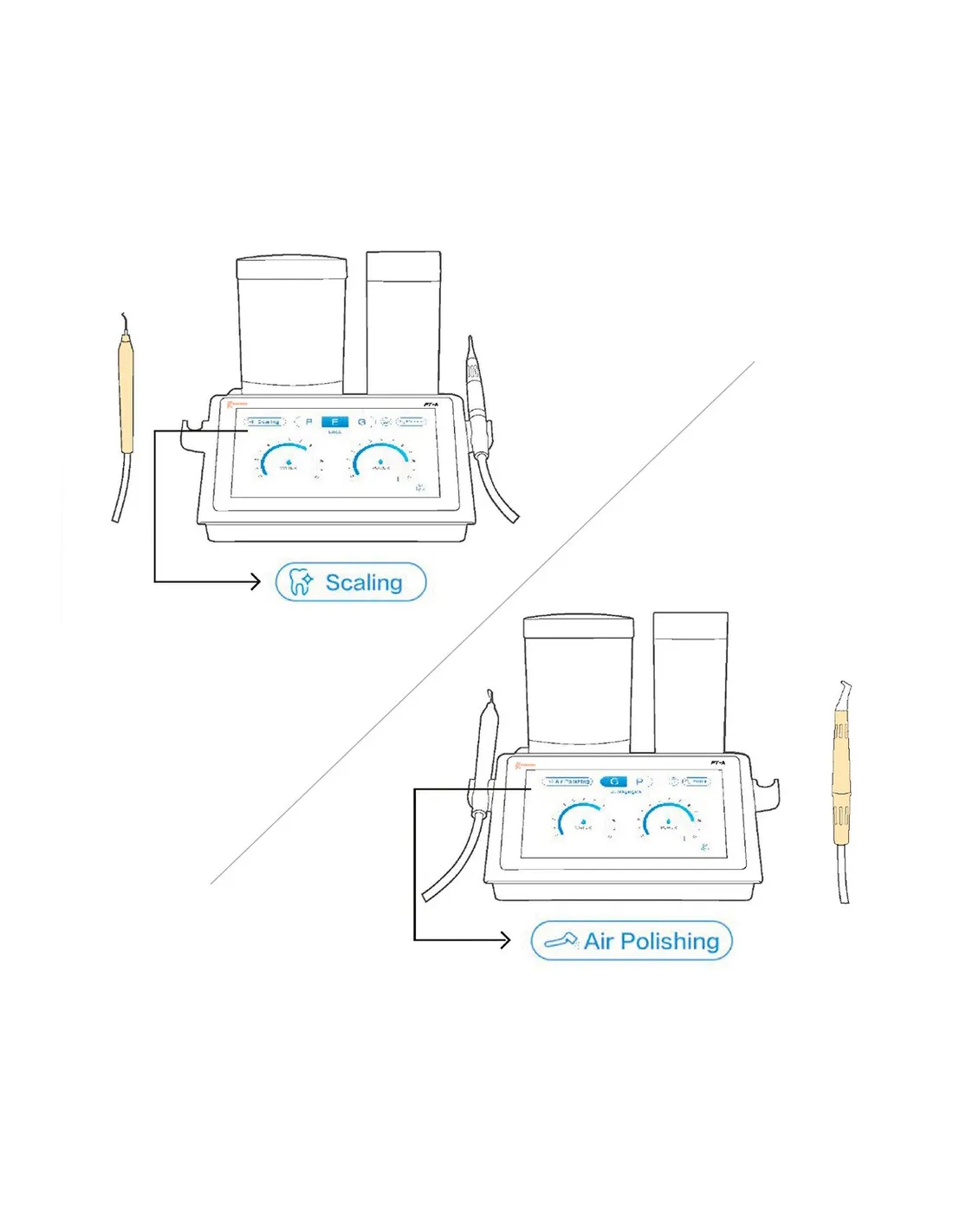Cuenta con función de reconocimiento automático del modo de uso: al levantar la pieza de mano ultrasónica, el equipo entra en modo de escalado por ultrasonidos y si se levanta la pieza de mano del aeropulidor, se activa automáticamente el modo para escalado por aeropulido.