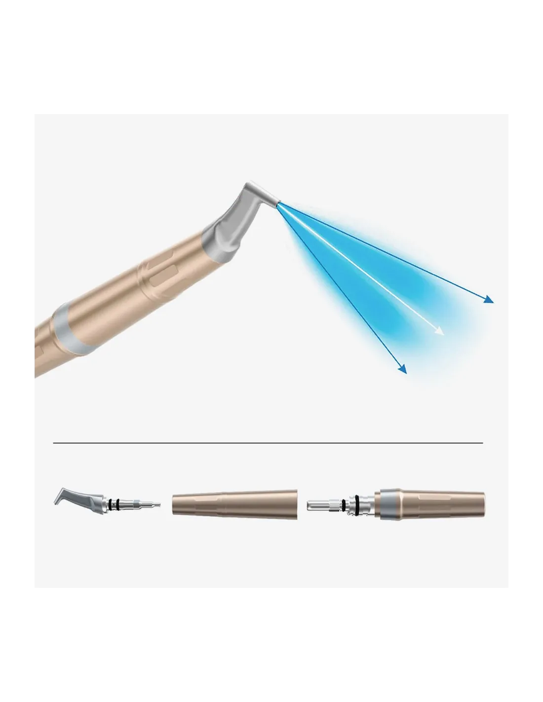Su sistema de aeropulidor ofrece una limpieza precisa y específica sin producir arañazos en la superficie dental ni daños leves en los tejidos blandos. Ideal para realizar una limpieza antes de pegar brackets de ortodoncia.