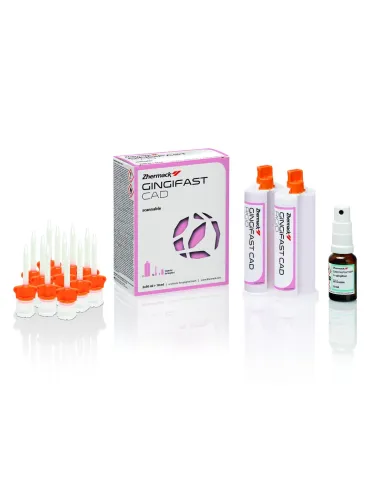 El envase de Gingifast CAD Rigid o Elastic de Zhermack contiene 2 cartuchos de 50ml, a elegir versión entre elástica o rígida, + accesorios.