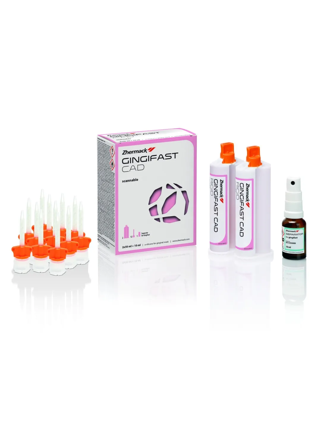 Gingifast CAD Rigid o Elastic de Zhermack es una silicona de adición líquida escaneable y legible sin la necesidad de utilizar sprays reflectantes.