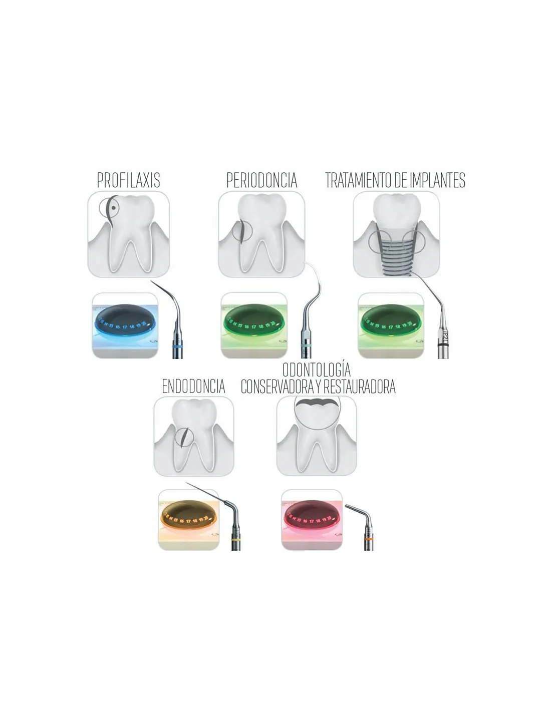 - Responde a todas las necesidades clínicas: profilaxis, periodoncia, tratamiento de implantes, endodoncia, cirugía endodóncica, odontología conservadora y restauradora.