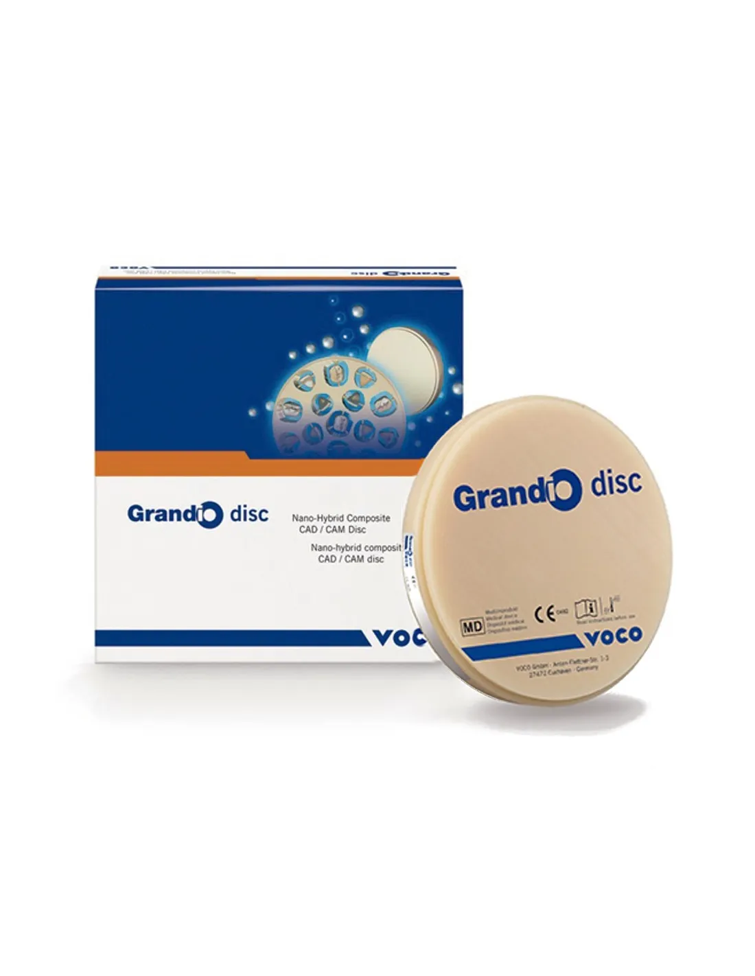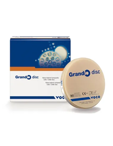 Grandio Disc de Voco es un disco de composite CAD/CAM empleado en la fabricación de restauraciones permanentes mediante la técnica de tallado de CAD/CAM: coronas, inlays, onlays, carillas y coronas soportadas por implantes.