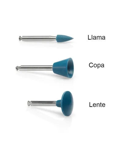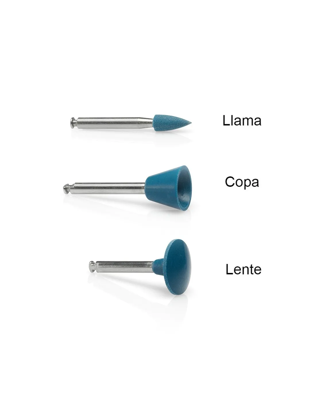 El pulidor de diamante azul oscuro para el prepulido presenta diferentes formas como "Copa", "Llama", "Lente".