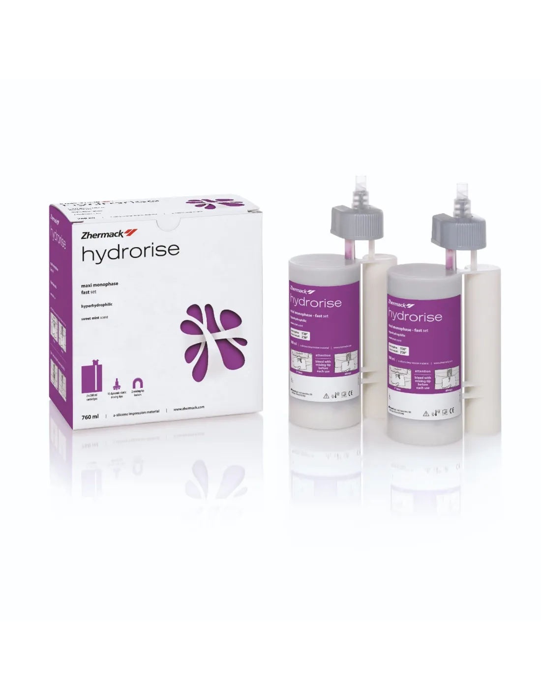 La silicona A Hydrorise Maxi Monophase Fast Set de Zhermack es una silicona de adición de viscosidad media para prótesis fija, implantes y removibles.