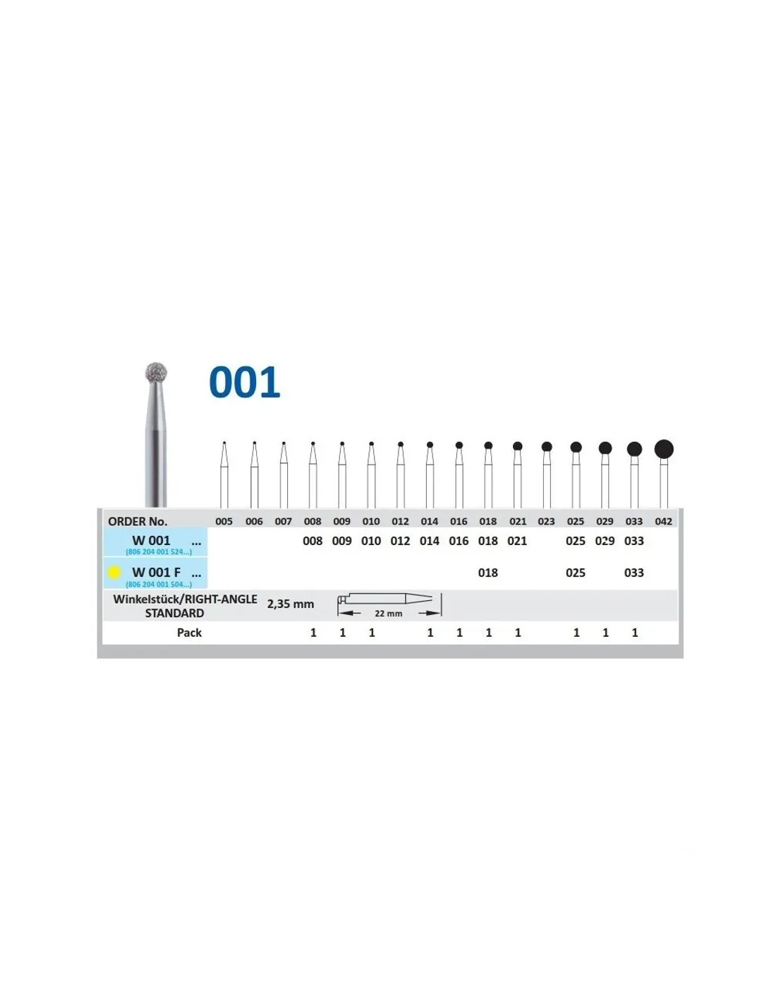 Fresa dental Horico 001 Figura 801 es una fresa diamante con forma de redonda, bola, para contraángulo (CA 204).