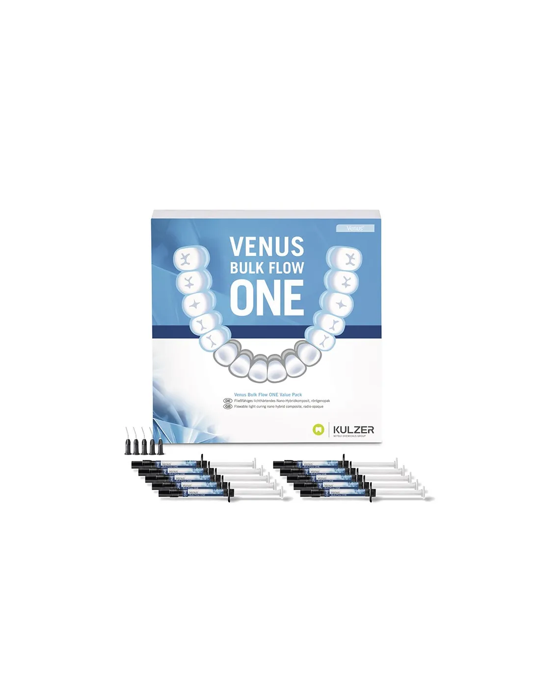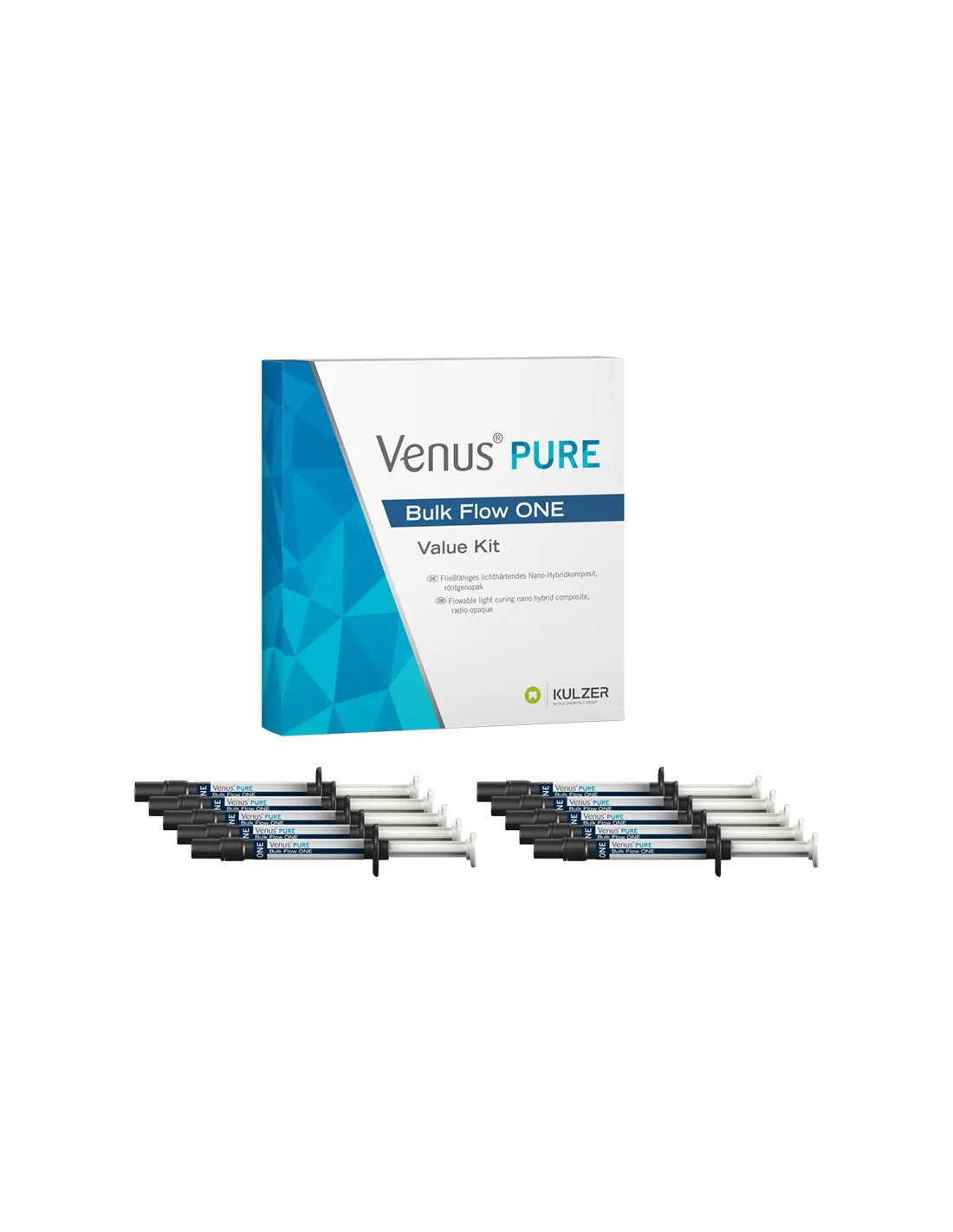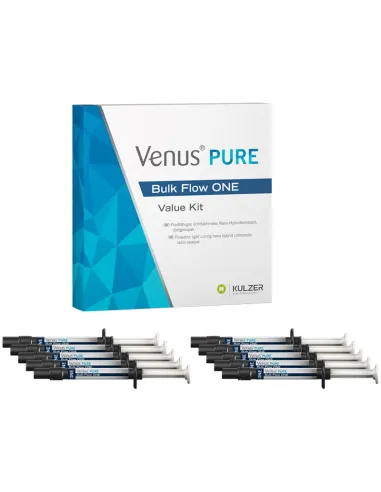 El Value Pack Jeringas de Venus Pure Bulk Flow ONE contiene 10 jeringas de 2 gr, 50 puntas aplicadoras, 1 tarjeta de trabajo y manual de instrucciones.