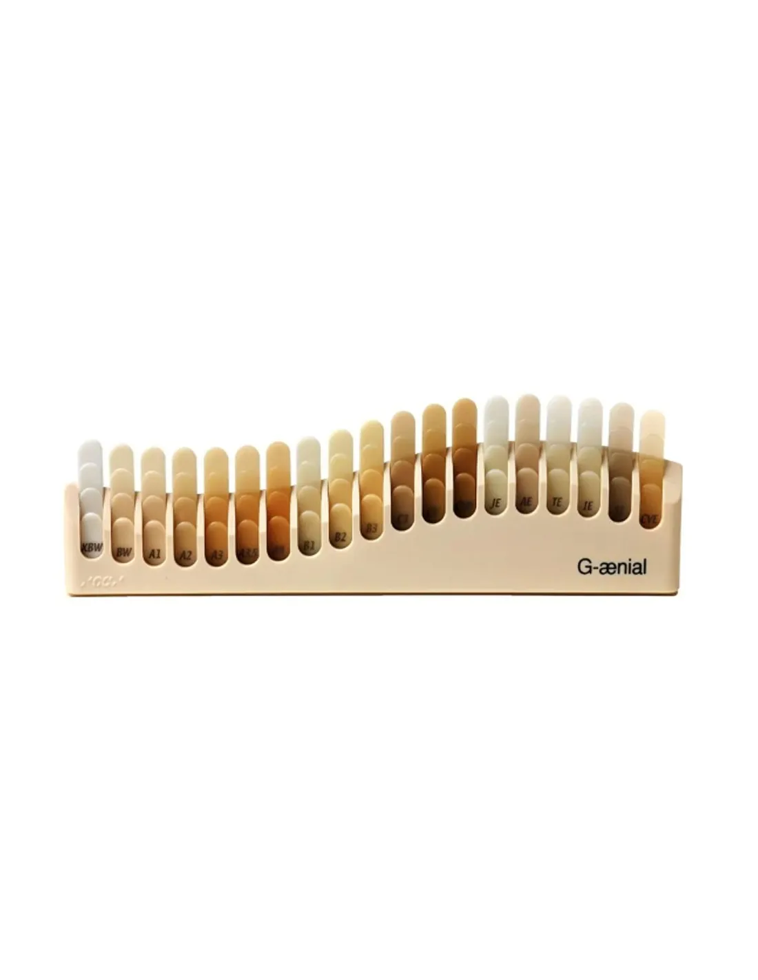 La guía de colores G-aenial presenta un diseño con grosor creciente que facilita la valoración por el odontólogo de la influencia del grosor de cada capa del composite en el tono final.