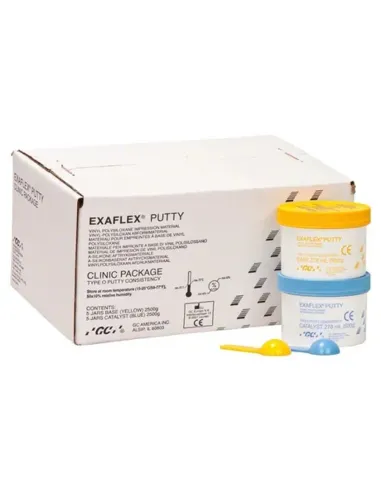 Exaflex de consistencia Putty (masilla) de fraguado normal está indicada como material base en la técnica de 2 materiales / 2 pasos.