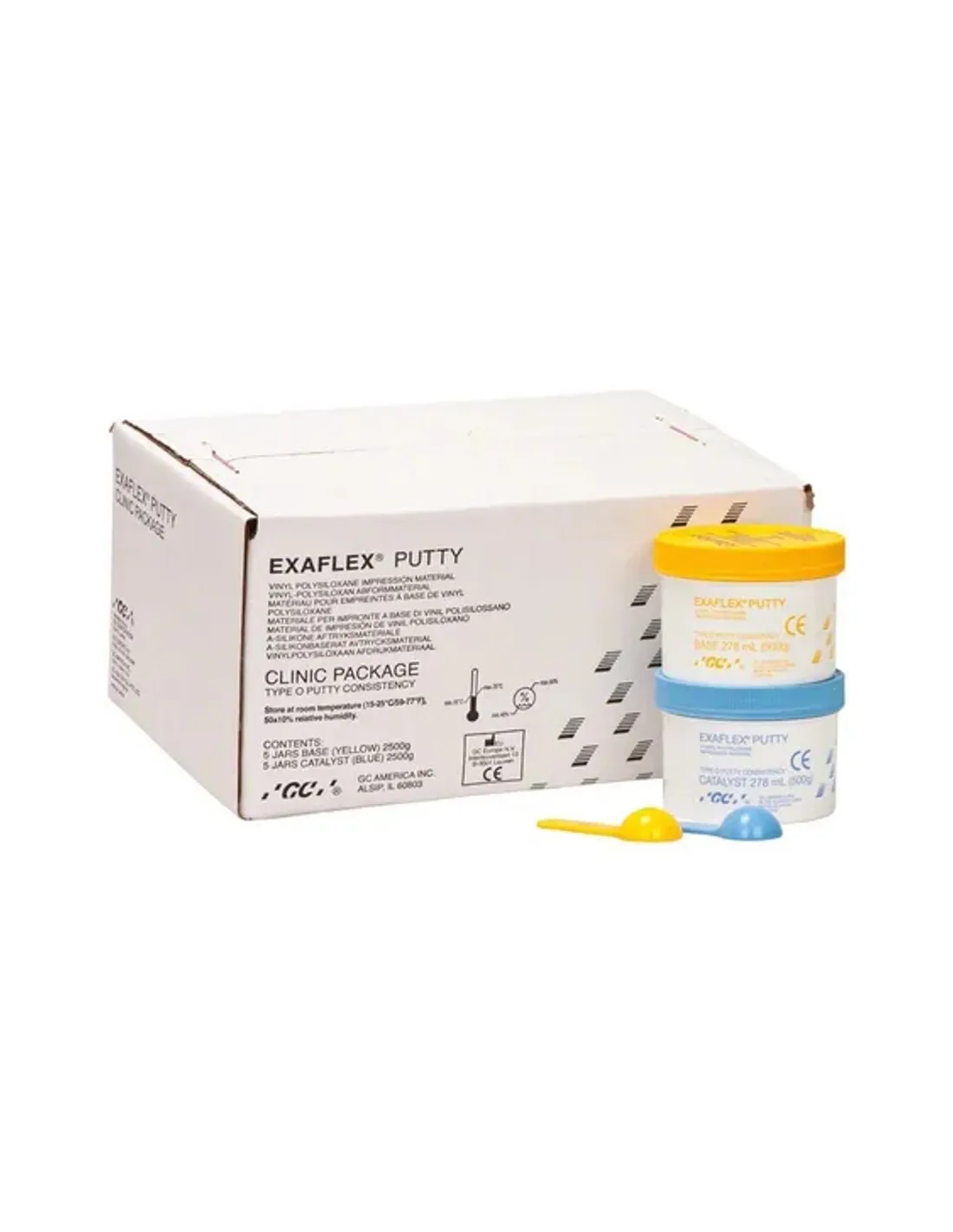 Exaflex Putty se presenta en pack especial para clínica: 5 tarros con 500g de base + 5 tarros con 500g de catalizador + accesorios