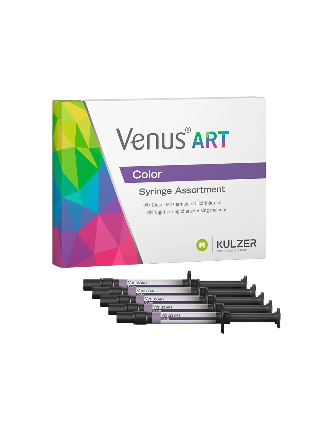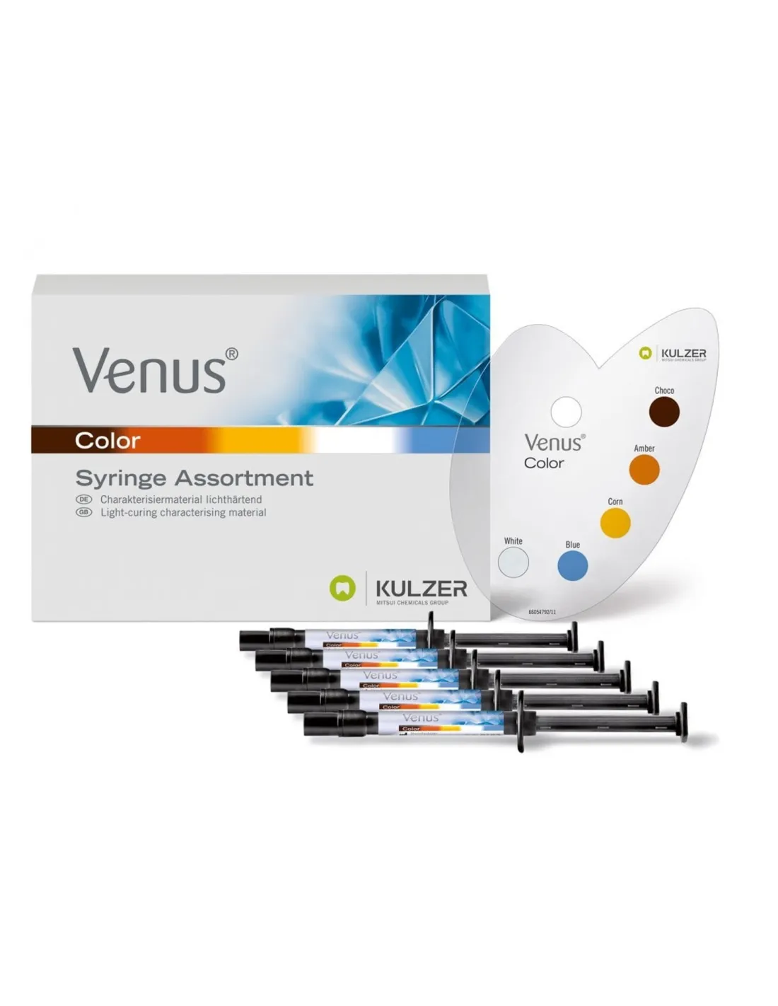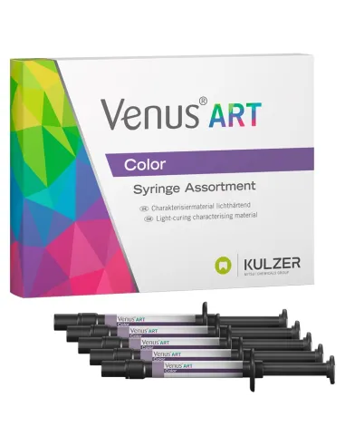 El kit surtido del composite Venus Art Color contiene 1 jeringa de 1 gr en las tonalidades: white, blue, corn, amber y choco.