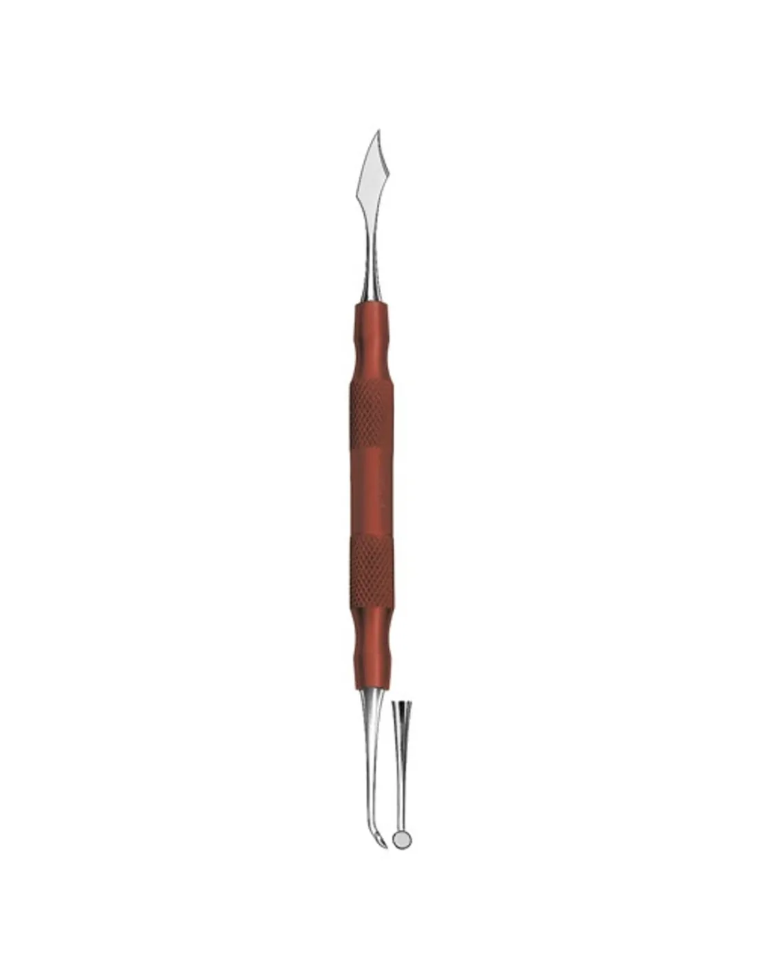 Consta de dos partes activas, una parte con forma de cucharilla angulada y otra, acabada en una espátula puntiaguda ligeramente curvada.