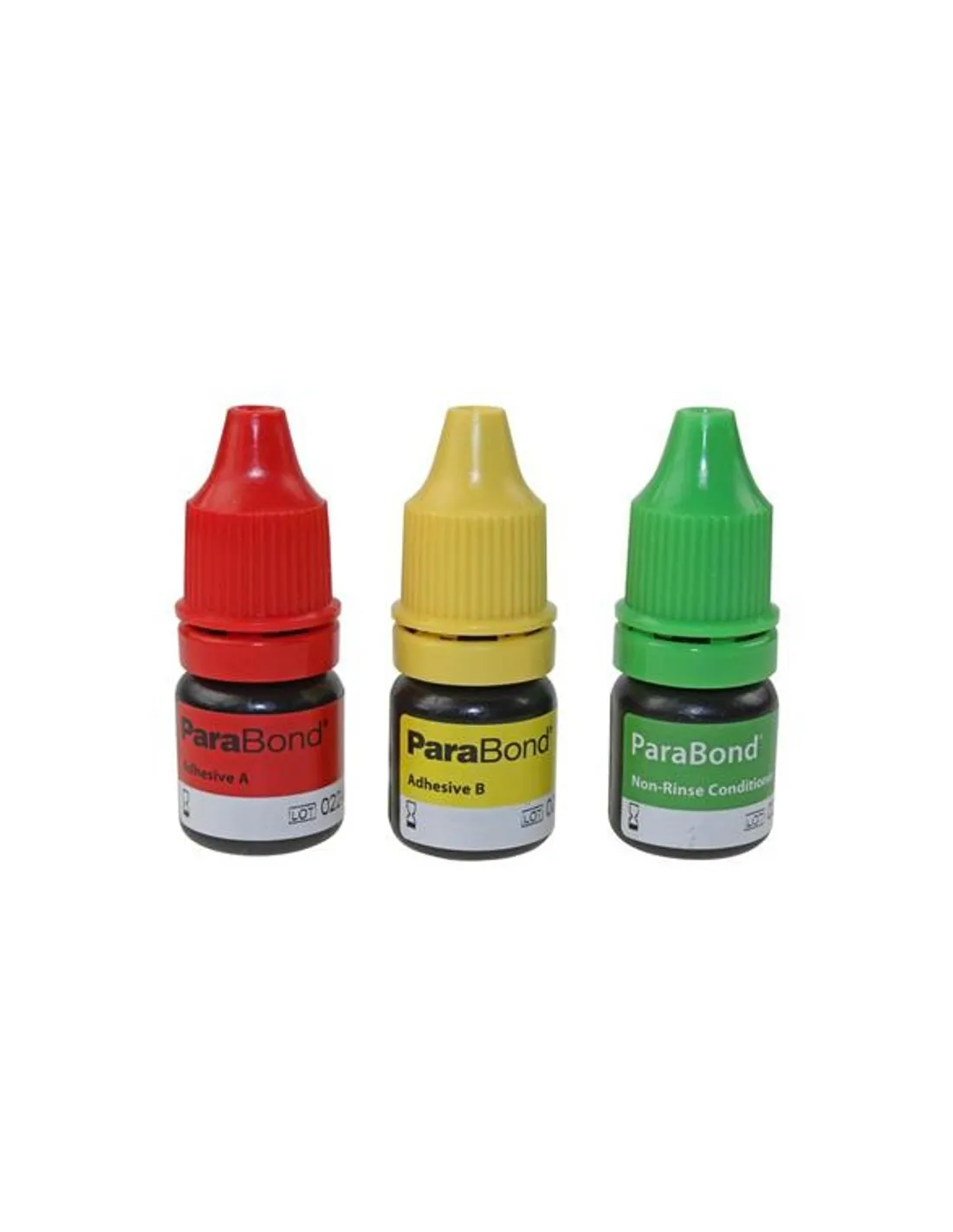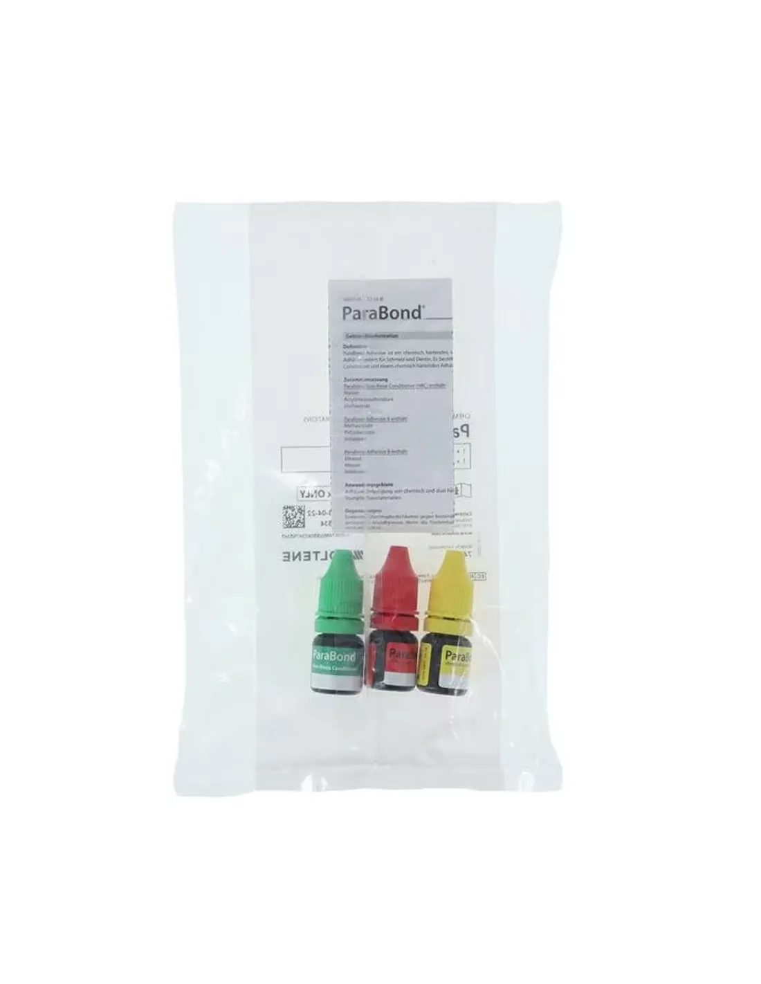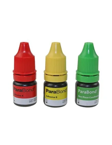 El sistema Parabond de Coltène consta de: 1 bote Non-Rinse Conditioner de 3 ml + 1 bote adhesivo A de 3ml + 1 bote adhesivo B de 3ml.