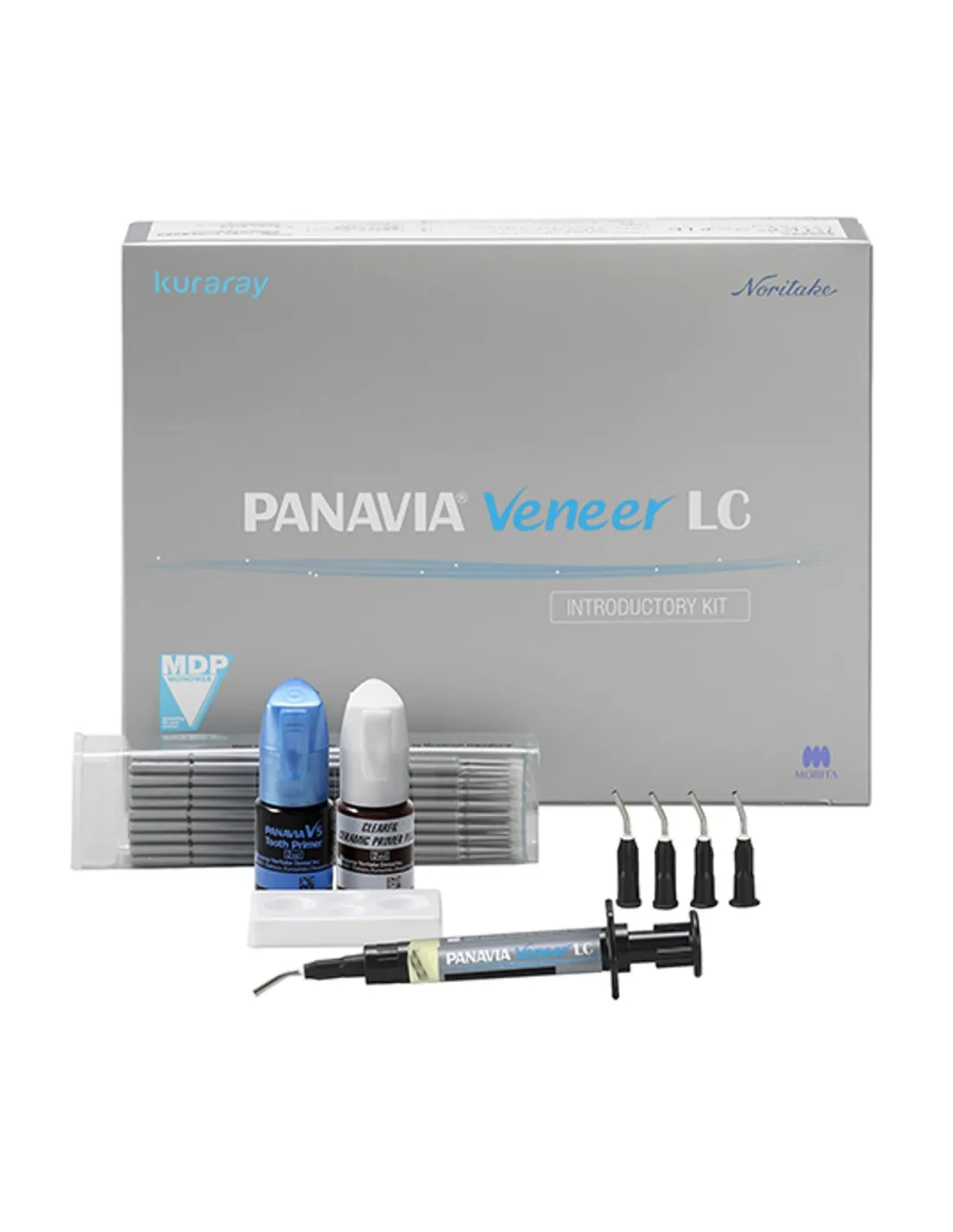 Panavia Veneer LC Paste + Ceramic Plus, imprimador de silano, óxido de zirconio y metal + K-Etchant, ácido fosfórico + Panavia V5 Try-in Paste + Tooth Primer + accesorios.