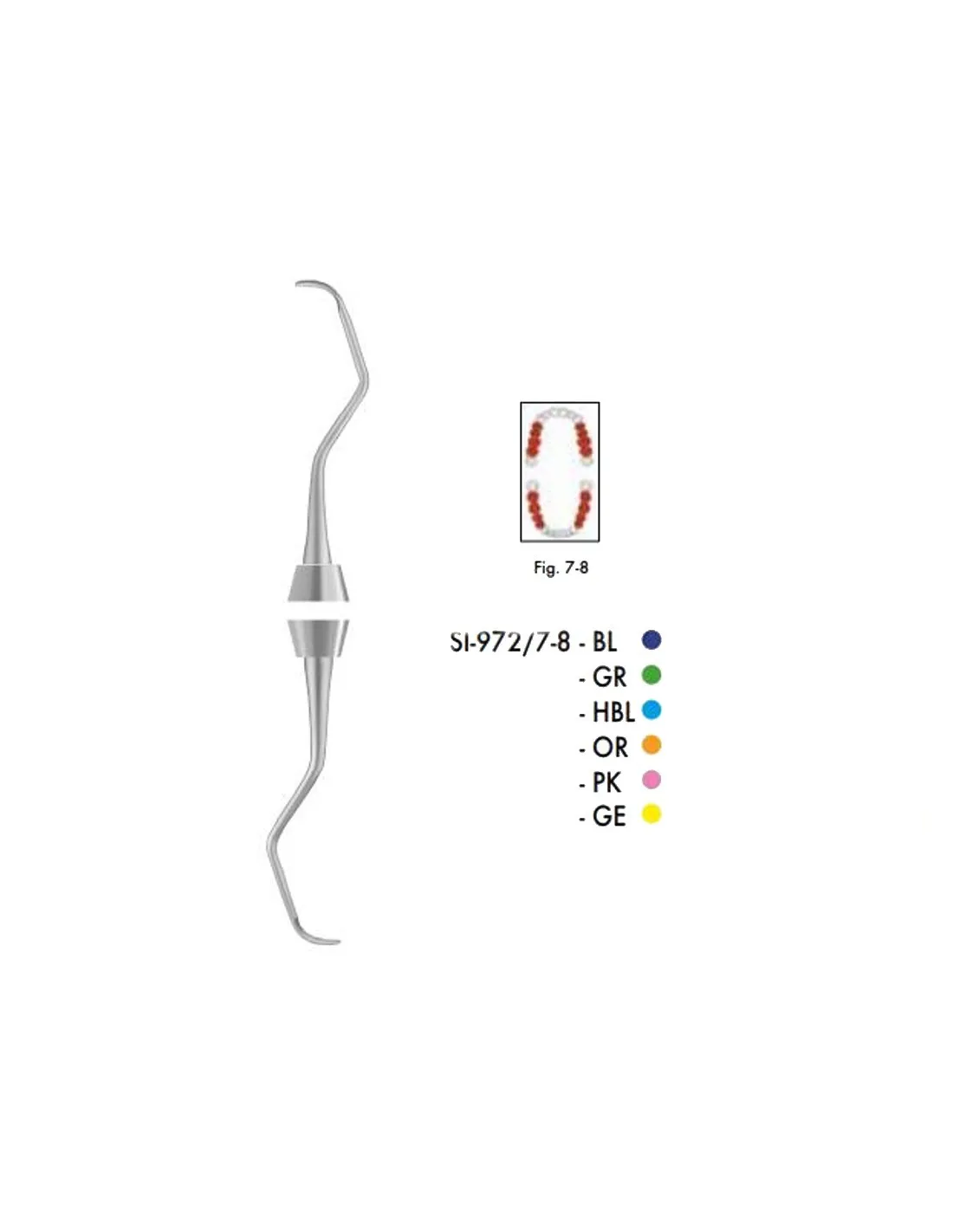 El instrumento dental SI972/7-8 de Carl Martin es una cureta Gracey 7-8 ligeramente angulada, con una parte activa de mayor longitud para acceder con más facilidad a las zonas difíciles.