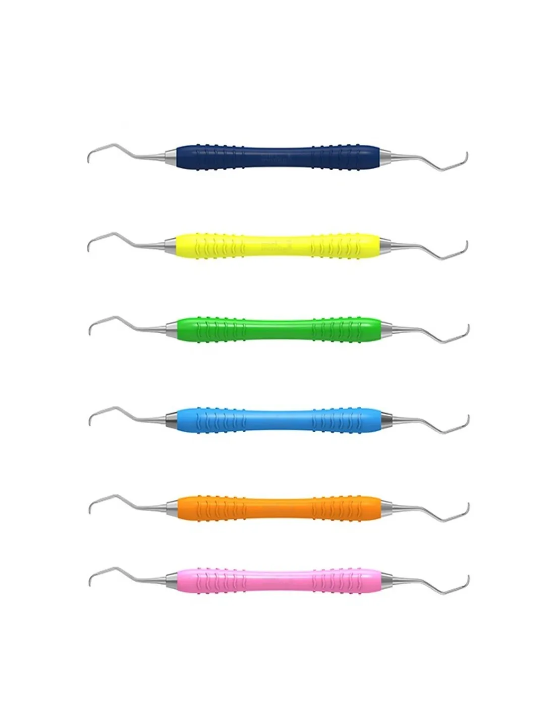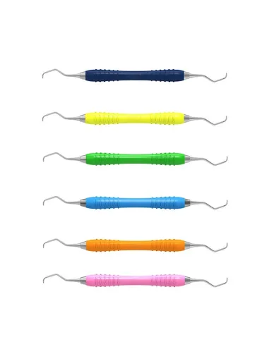 Con mango de silicona, Colori Silikon, termoestable y antideslizante de núcleo de acero inoxidable muy ligero y sellado antibacteriano. Mangos codificados por color para una identificación sencilla del instrumental.