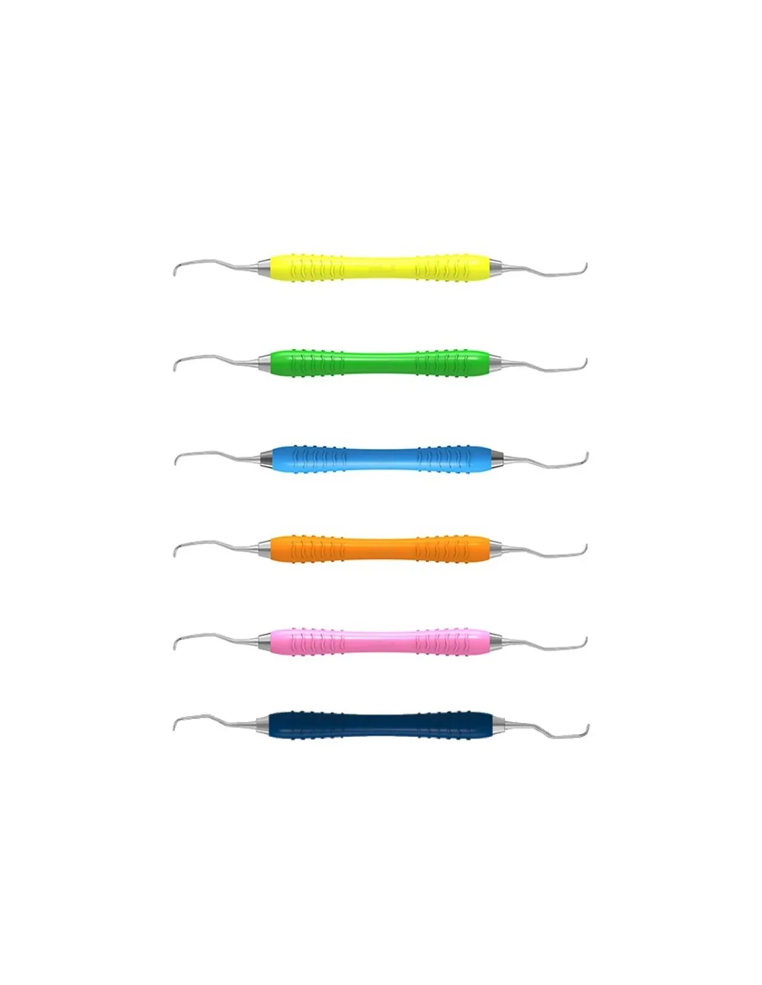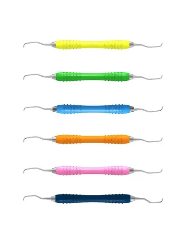 Con mango de silicona, Colori Silikon, termoestable y antideslizante de núcleo de acero inoxidable muy ligero y sellado antibacteriano. Mangos codificados por color para una identificación sencilla del instrumental.
