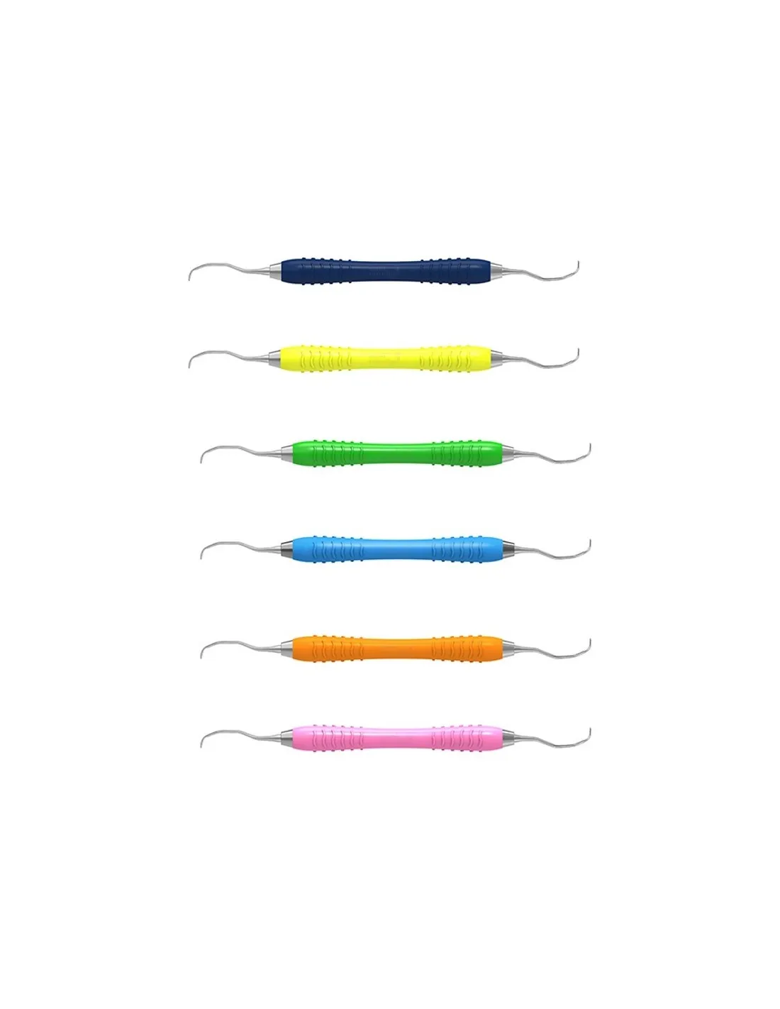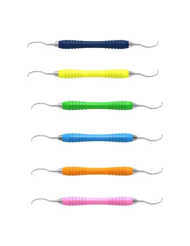 Con mango de silicona, Colori Silikon, termoestable y antideslizante de núcleo de acero inoxidable muy ligero y sellado antibacteriano. Mangos codificados por color para una identificación sencilla del instrumental.