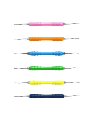 Con mango de silicona, Colori Silikon, termoestable y antideslizante de núcleo de acero inoxidable muy ligero y sellado antibacteriano. Mangos codificados por color para una identificación sencilla del instrumental.