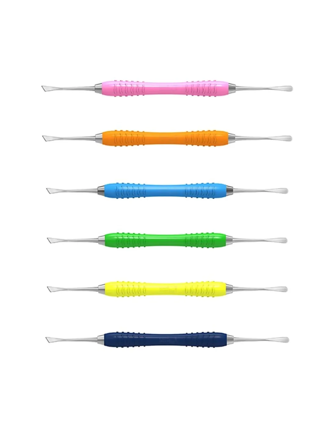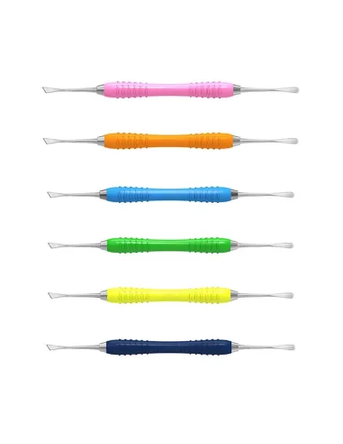 Con mango de silicona, Colori Silikon, termoestable y antideslizante de núcleo de acero inoxidable muy ligero y sellado antibacteriano. Mangos codificados por color para una identificación sencilla del instrumental.