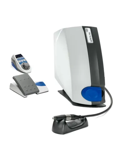 El equipo incluye: consola de mesa, mando de control externo con display digital, pieza de mano de alta velocidad y pedal.
