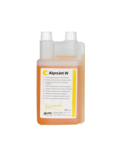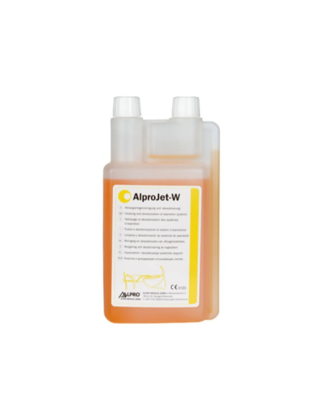 AlproJet W de Alpro Medical es un concentrado líquido de alta eficacia indicado para la limpieza y el mantenimiento semanal de sistemas de aspiración dental con y sin separador de amalgama.