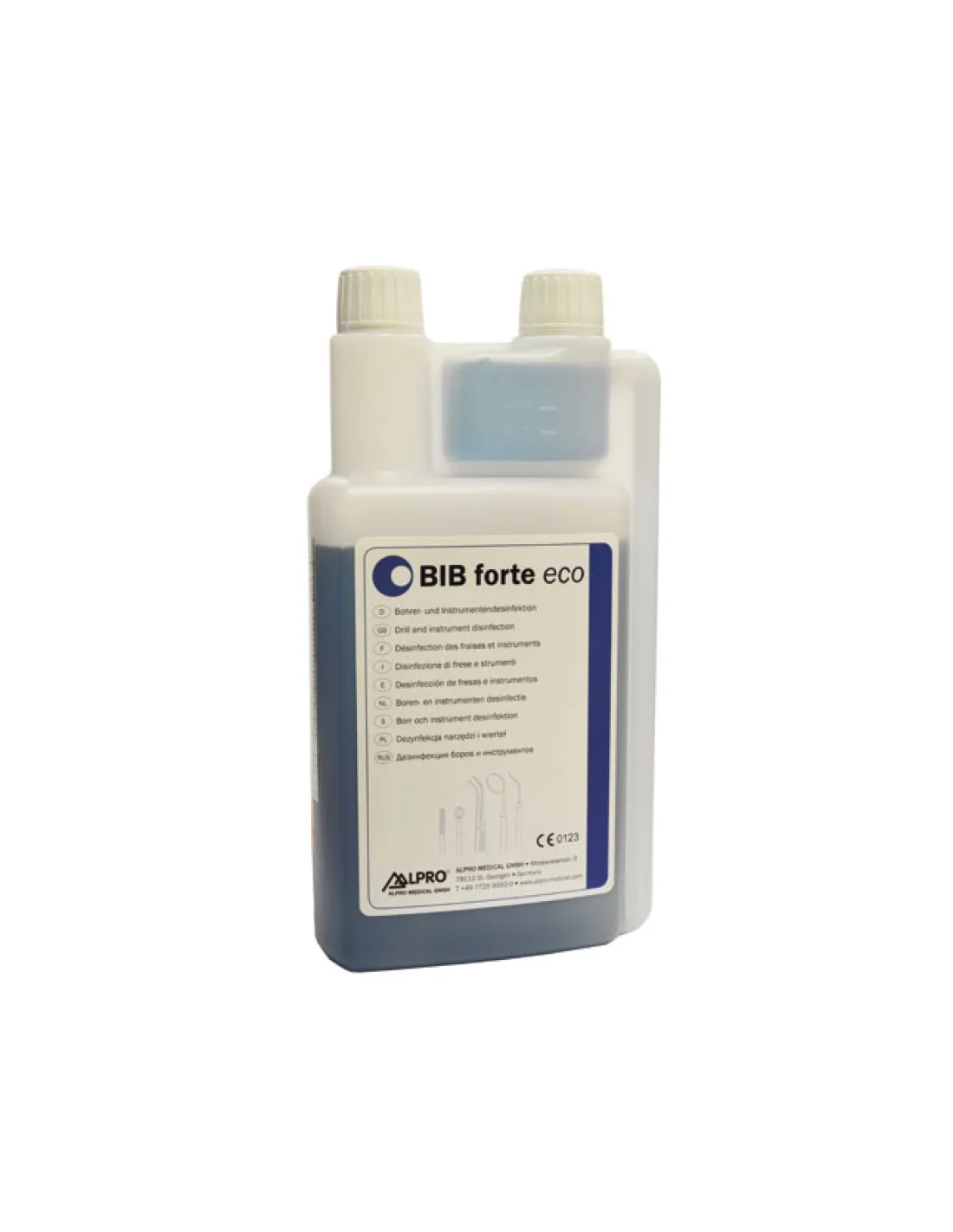 BIB Forte Eco de Alpro Medical es un concentrado líquido para la limpieza y desinfección sin fijación de proteínas de instrumentos médicos e instrumental dental rotatorio de precisión y endoscopios.