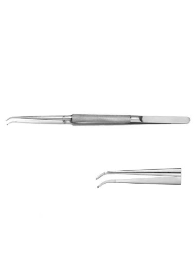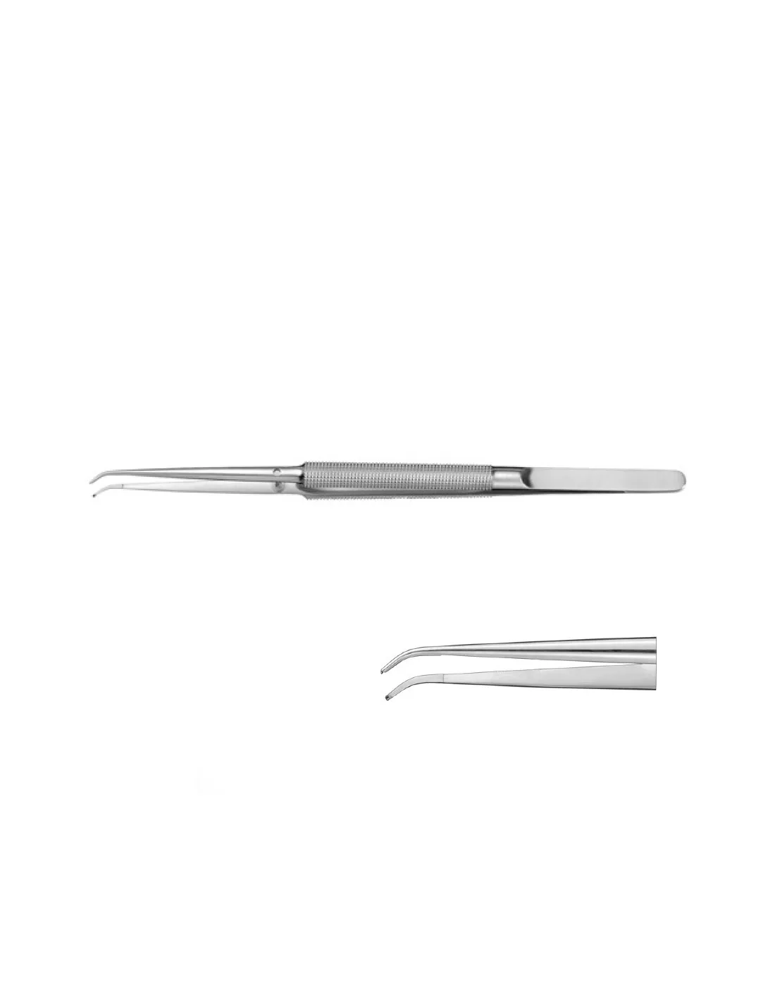 La micro pinza curvada para cirugía está indicada para la sujeción atraumática de los tejidos finos y para colocar membranas (sin perforación) durante procedimientos quirúrgicos.