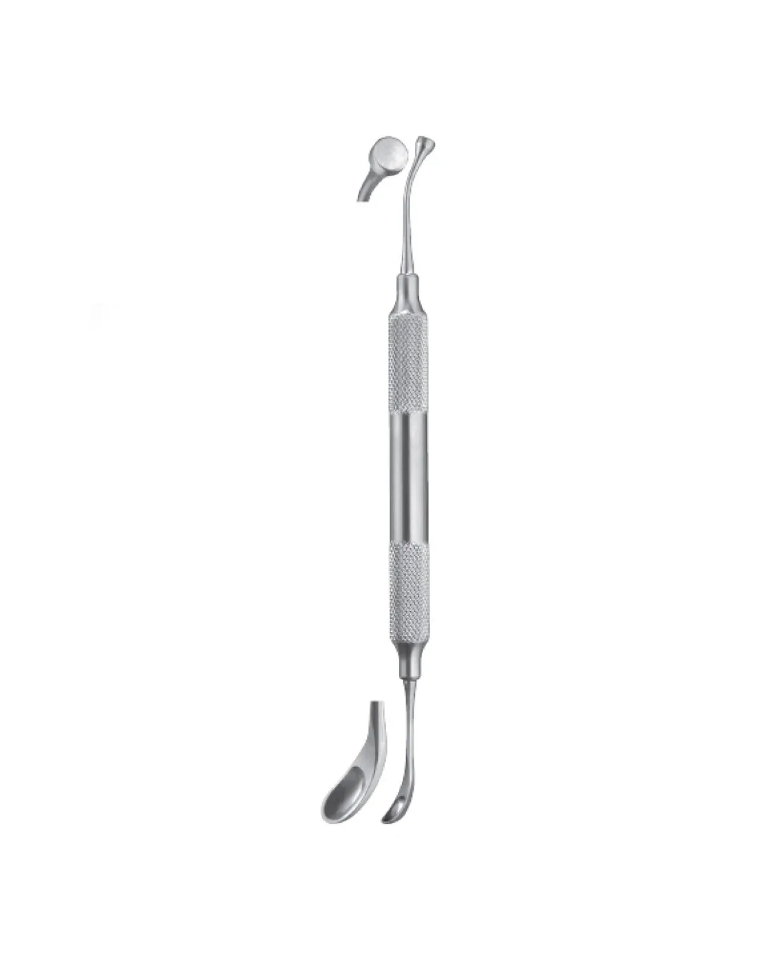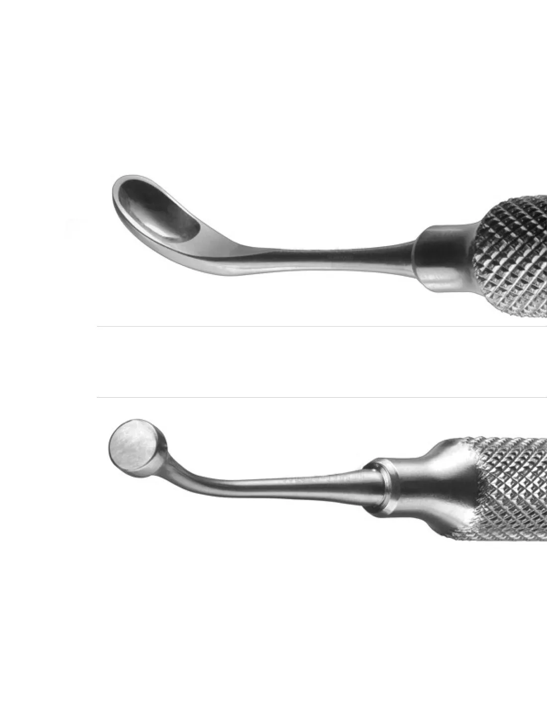 Por un lado, una cucharilla para recoger el material óseo del vaso de mezcla ósea de forma rápida y segura, para su posterior colocación en el lugar correspondiente. Y por otro, la parte taponadora ancha y plana indicada para introducir y compactar el material óseo.
