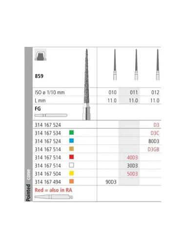 Con forma de lanza cono puntiaguado, la fresa 859-011 es una fresa diamante de grano extra fino, 15 µm, con marca amarilla.